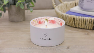 - IN-HOUSE DESIGN: The new & innovative candle offers a unique message for your loved one within the wax as time progresses. You will see a typewriter written an "Our Memories And Laughter Will Last A Lifetime" sentiment after about 15 minutes. As you watch, the entire decal with a butterfly and two birds sitting on a rose floral stem design will appear after 80 minutes. Then, the message will hide again and reappear with each burn. The front of the candles has a simplistic "Friends" decal accompanied by an overlapping double hand-drawn feel heart on a matte white exterior smooth-edged vessel with a glossy interior with walls that features a black & white floral design along with a pink & green rose design.