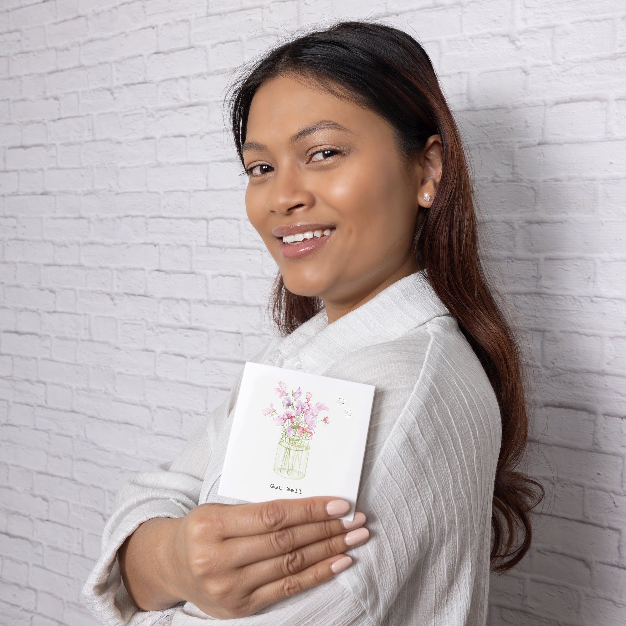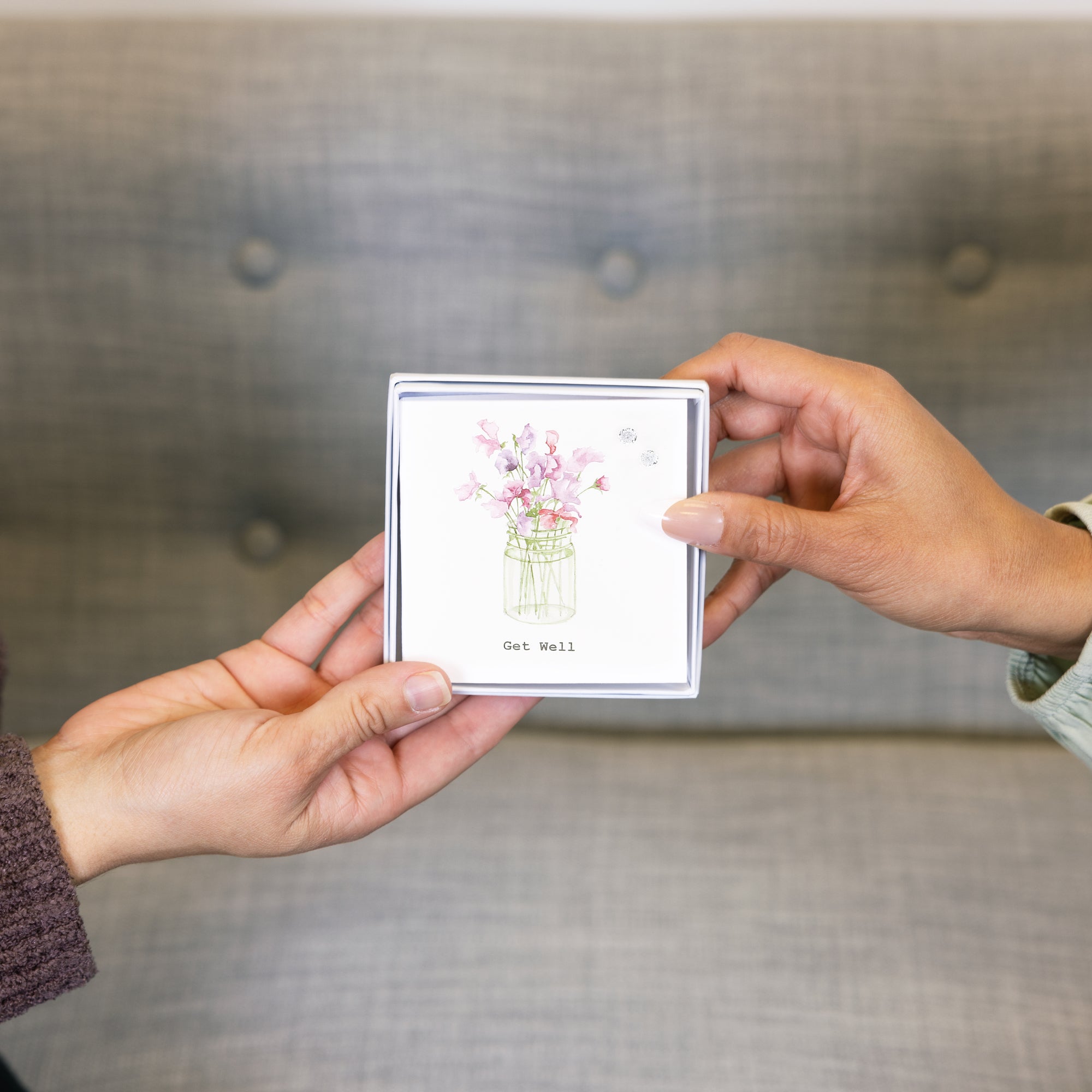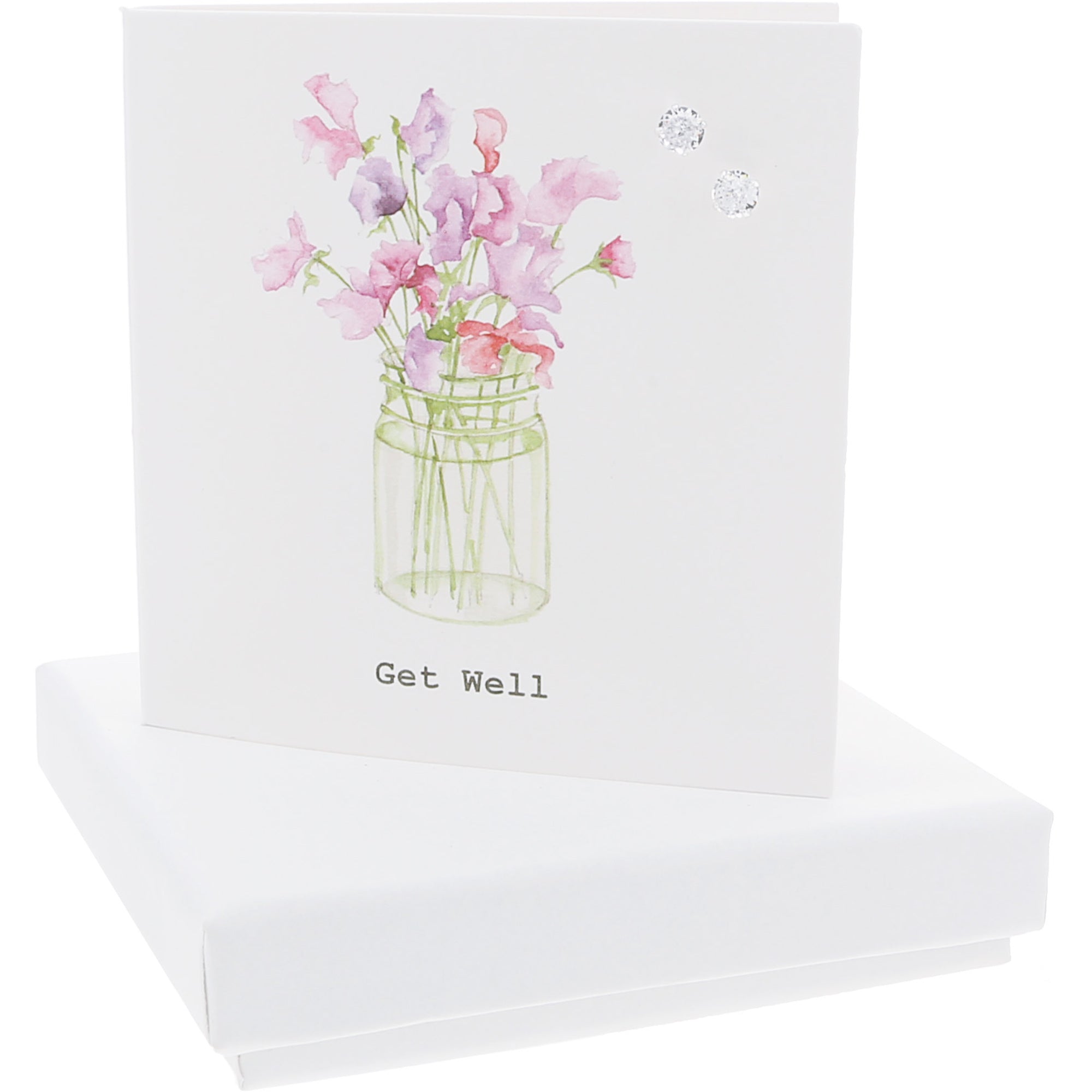 - IN-HOUSE DESIGN: The printed card has a beautiful floral-filled vase design. The earrings are strategically placed within the florals. The typewritten white "Get Well" sentiment is placed in the center of the greeting card.