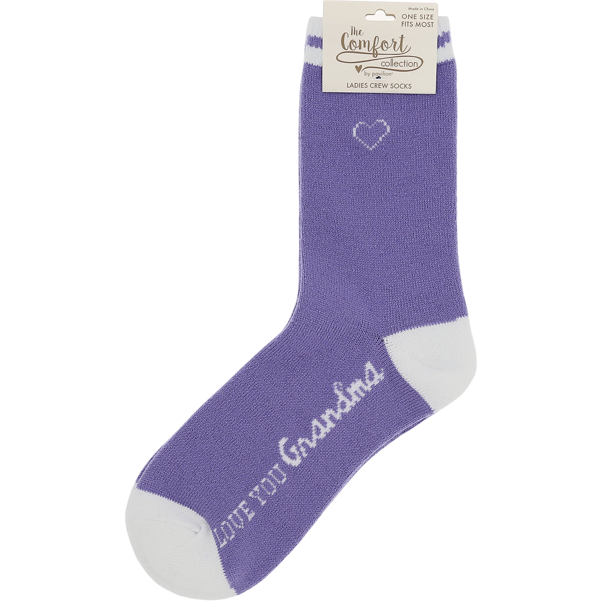- IN-HOUSE DESIGN: The crew socks have a cream ankle, toe & heel with a purple body and a cream "Love You Grandma" sentiment on the outer lateral of the boot socks. In addition, a small cream-outlined heart is right at the ankle below the striped top. This design reflects on the exterior of each hose.
