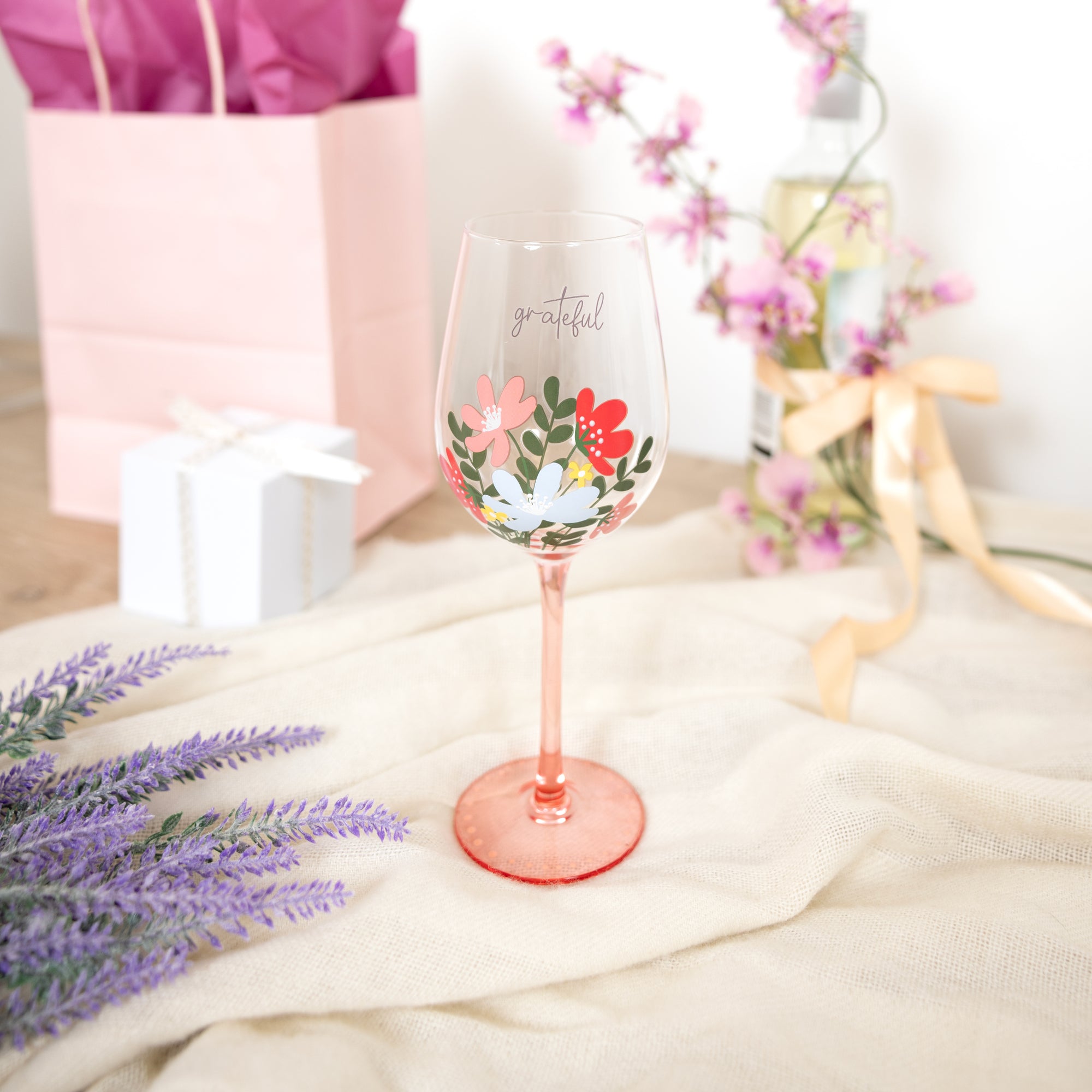 - IN-HOUSE DESIGN: The pink-tinted glass stem has raised puffy paint bumps circled at the bottom. A bouquet of pink, red, yellow, and blue flowers has white puff paint accents, and the "Grateful" sentiment is placed on the front side of the glass.