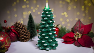 - IN-HOUSE DESIGN: The green wax pine tree has frosted white snow tips and an added sparkling glitter touch. The waving flame imitates a real candle without the risks of open fire that can be hazardous to densely decorated areas. Also beneficial to those with allergies to scented candles.