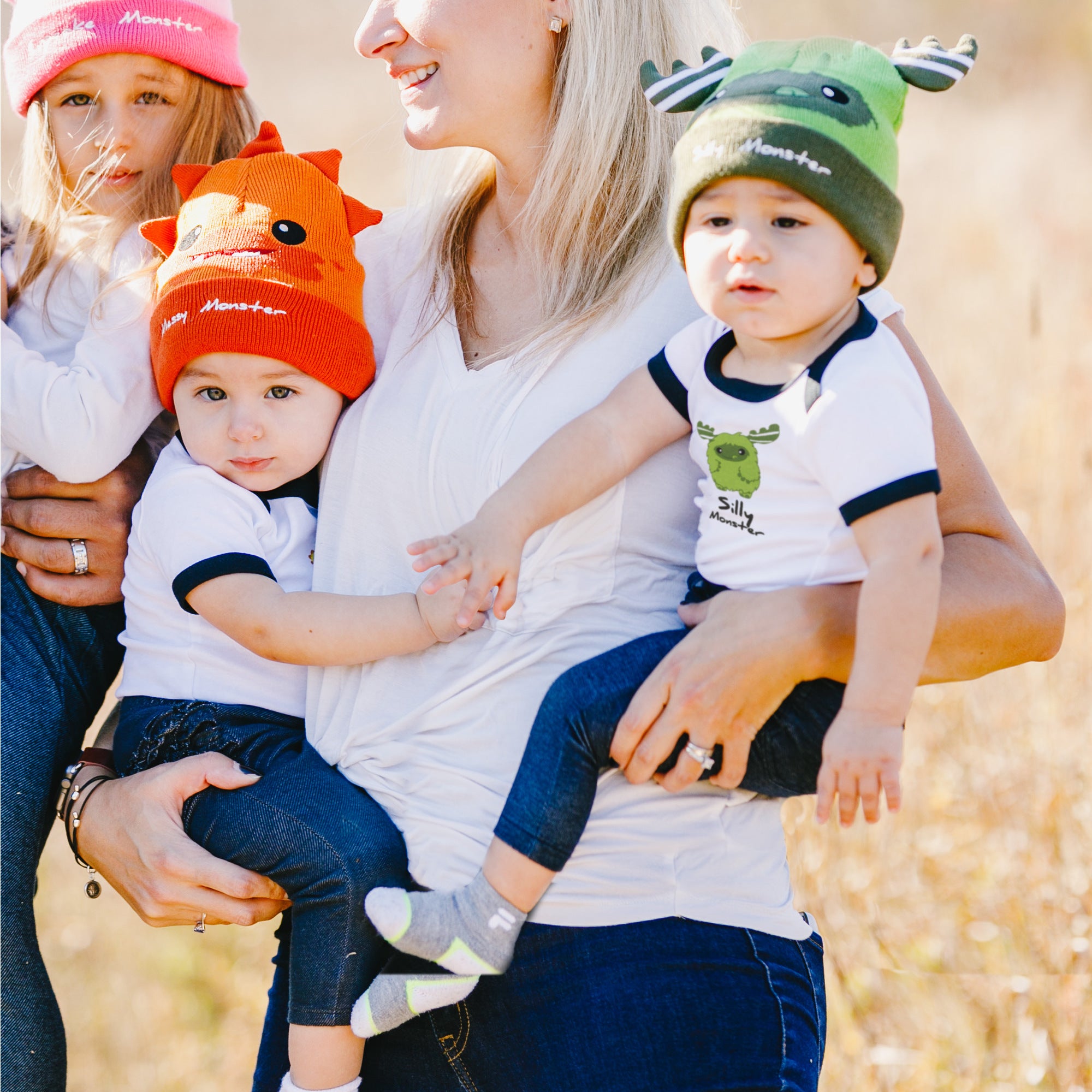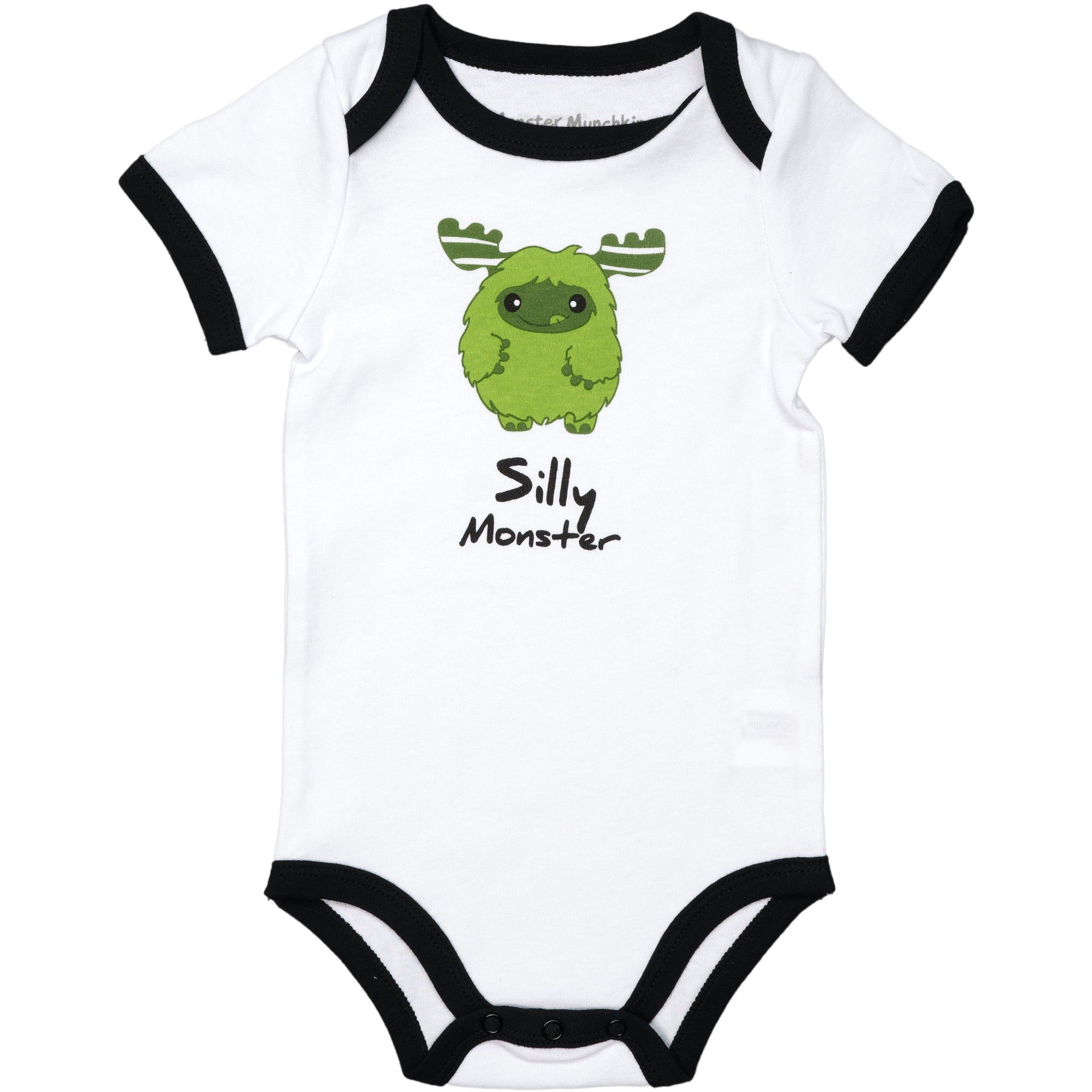 - IN-HOUSE DESIGN: Black trimmed edges go around the neck, arms, and thighs. The big fuzzy moose antlered monster is sticking his tongue out and is accompanied by "Silly Monster" screen-printed sentiment on the front center of the bodysuit. Itch-free tagless sizing is printed on the interior collar.