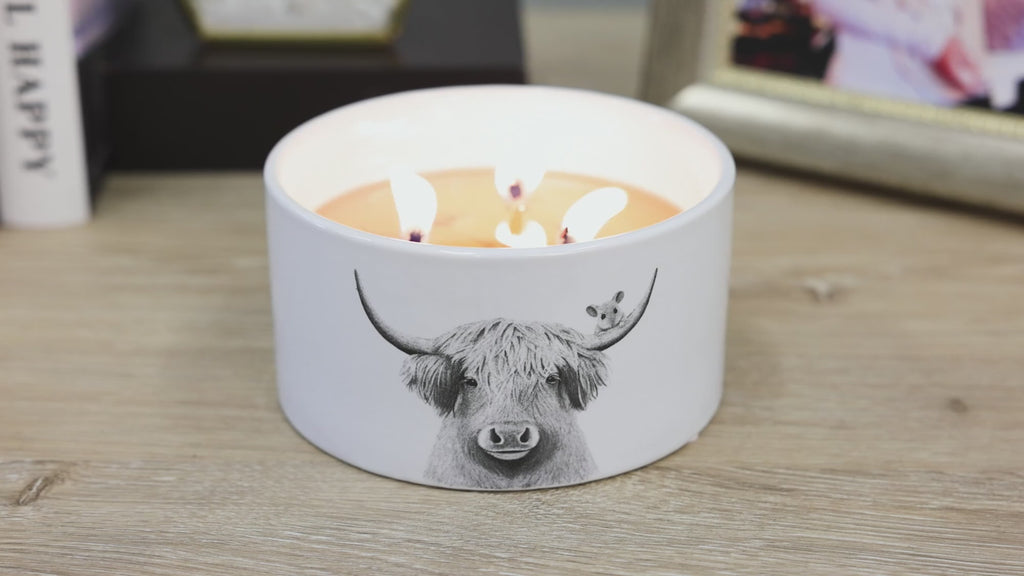 - IN-HOUSE DESIGN: Adorned with a charming Highland cow illustration on the outside, this candle is both whimsical and artistic. The wax reveal adds an element of surprise and delight: after 10 minutes of burn time, Highland cow faces start to emerge from the wax, becoming fully visible after 60 minutes. The candle holder is decorated with a detailed highland cow decal, adding a textural element that makes it stand out as a unique decor piece.
