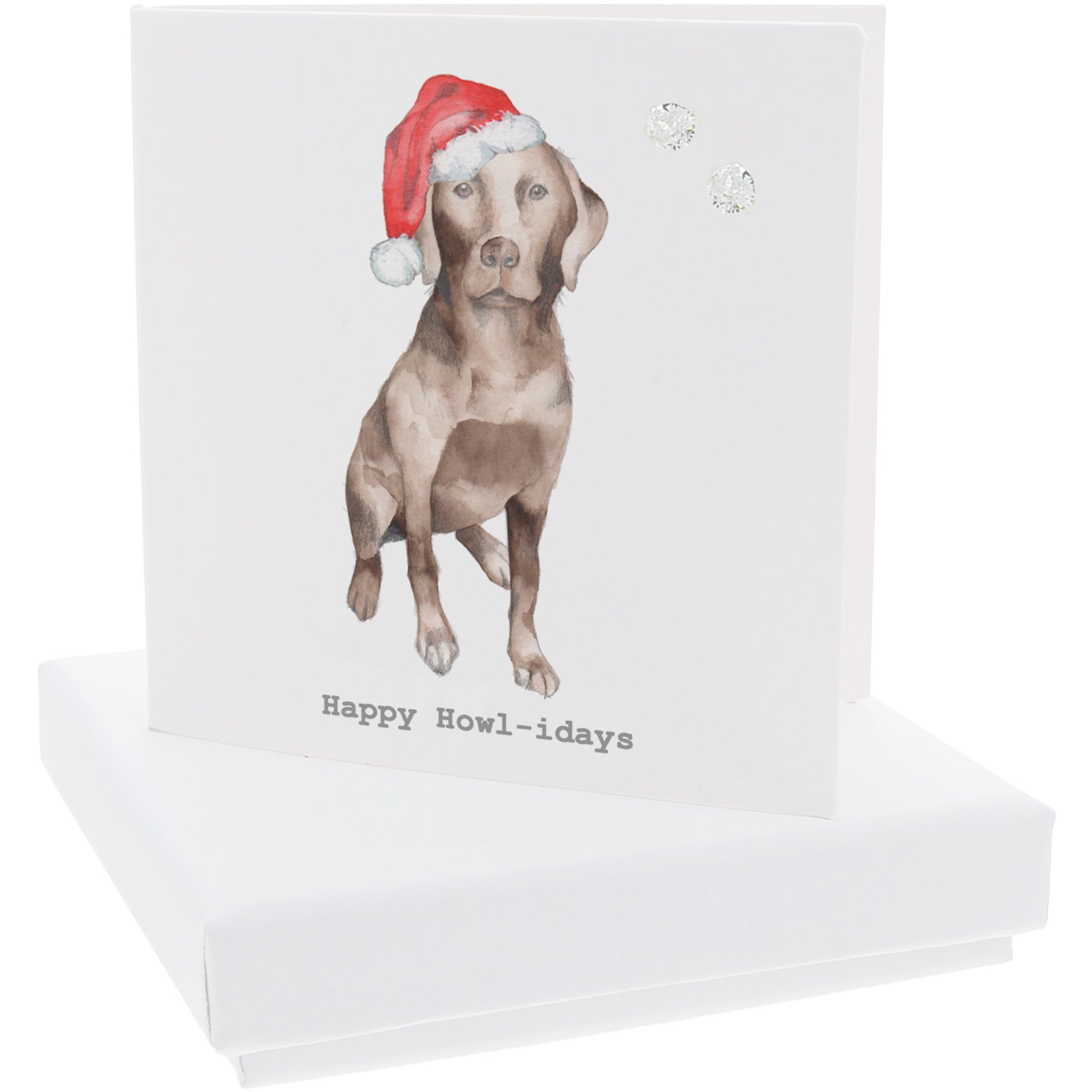 - IN-HOUSE DESIGN: The brown dog with a red Santa hat offers a winter wonderland feel. Below it is the gray, typewritten "Happy Howl-idays" sentiment, whereas the earring is placed in the upper right.