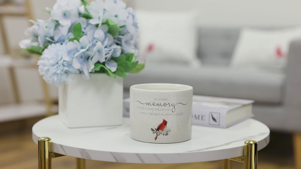 - IN-HOUSE DESIGN: You'll witness delicate cherry blossom branches with cardinal and the sentiment "Love Lasts Forever" begin to show 10 minutes into burning. After an hour, the entire decal unveils, only to retreat & resurface with each subsequent burn. The front of this candle is adorned with a quote: "In Loving Memory Of A Life So Beautifully Lived And A Heart So Deeply Loved," accompanied by a cardinal bird on a cherry blossom branch. Ombre white & gray pattern, speckled with gray accents.