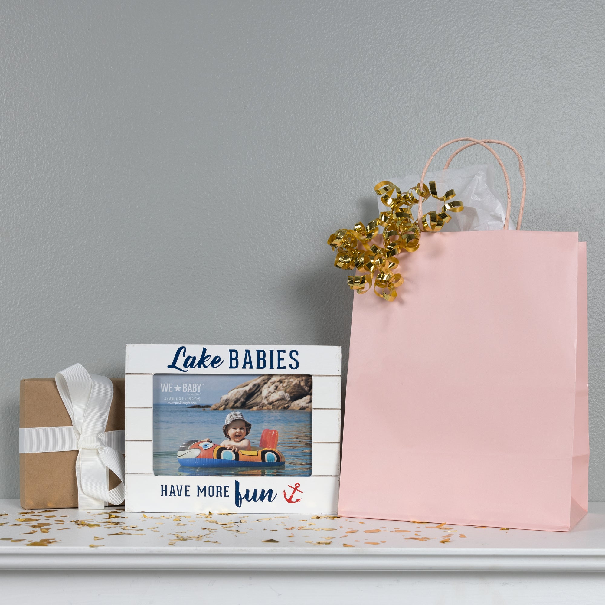 - IN-HOUSE DESIGN: The top and bottom sections of the frame hold the navy "Lake Babies Have More Fun" sentiment accompanied by a red anchor. The second, third, and fourth sections contain the photograph. The overall look of the frame is rustic, modern, and whitewashed. The outer edge of the frame is navy with a white anchor, blue fish, red oars, fish hooks, and white anchors.