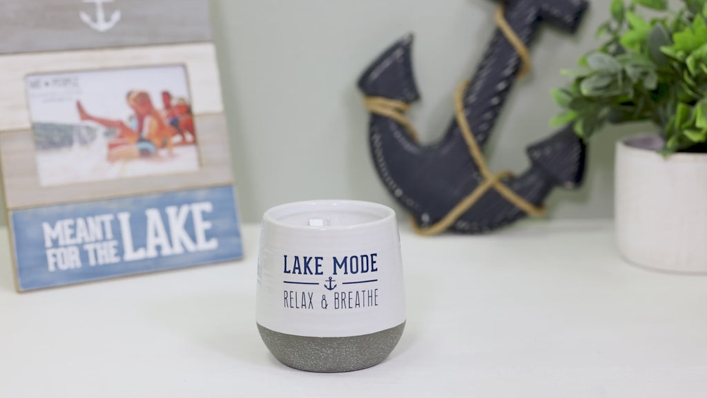 - IN-HOUSE DESIGN: The new and innovative candle offers a unique hidden special message within the wax as time progresses. The wax reveal begins to show after 10 minutes and is fully visible after 50 minutes of burn time. Overall burn time is 27-30 hours. The front side of the vessel features a blue anchor and line design accompanied by a "Lake Mode. Relax & Breath" sentiment. The wax has a sizeable blue anchor design.
