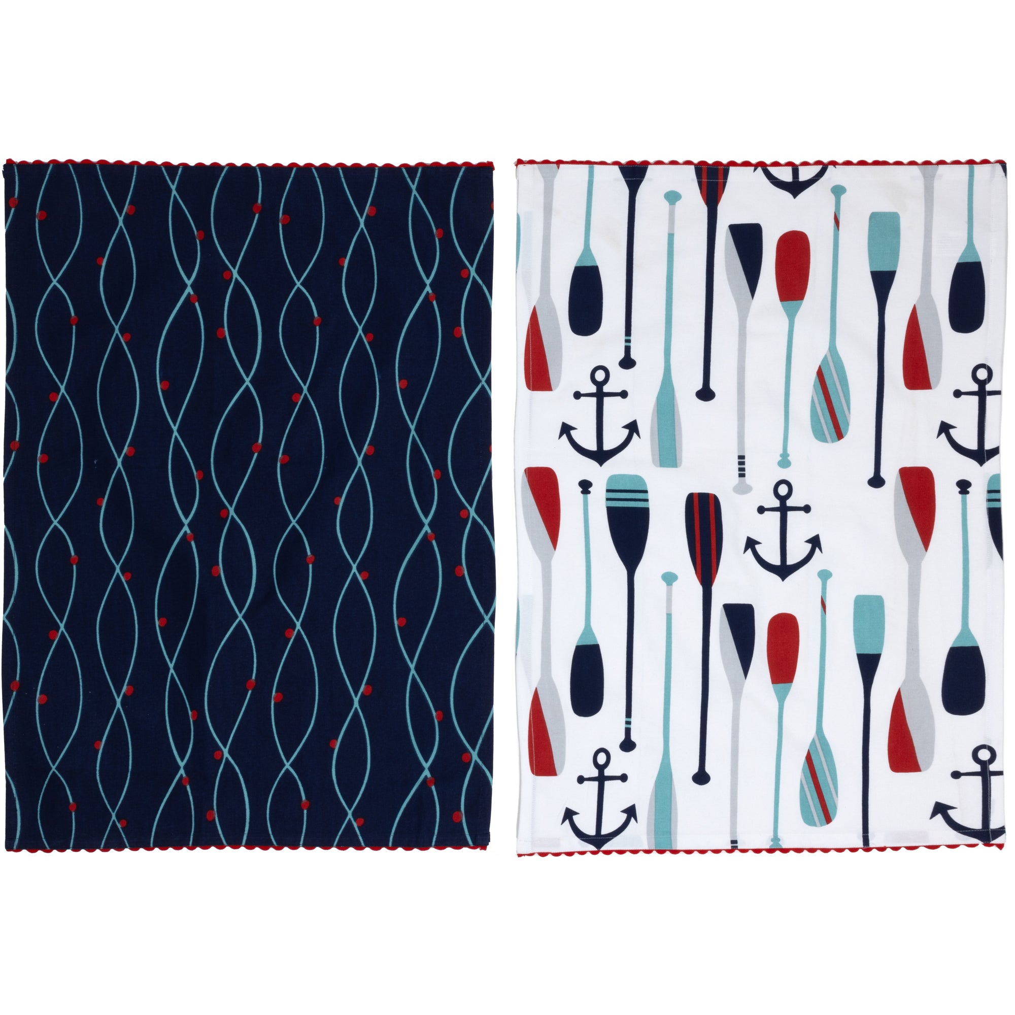 • IN-HOUSE DESIGN: Each towel bears its own design. One with large red/blue/gray anchors and oars with red wavy trim on a white background. The second towel features a light blue wavy, red polka dot pattern on a blue background and red wavy trim.