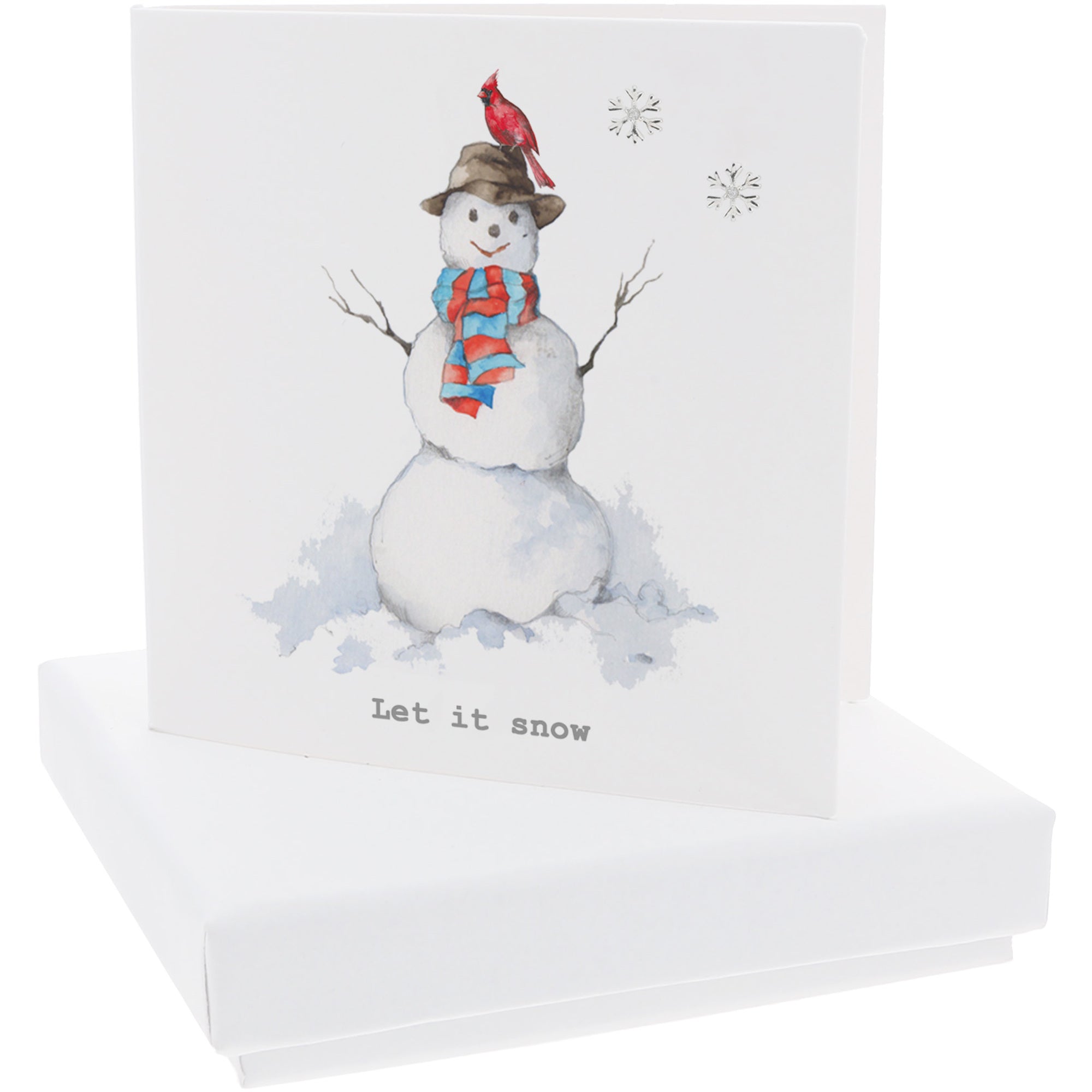 • IN-HOUSE DESIGN: The snowman with a cardinal on it's head is in a winter wonderland. Below it is the gray, typewritten "Let It Snow" sentiment, whereas the earring is placed in the upper right.