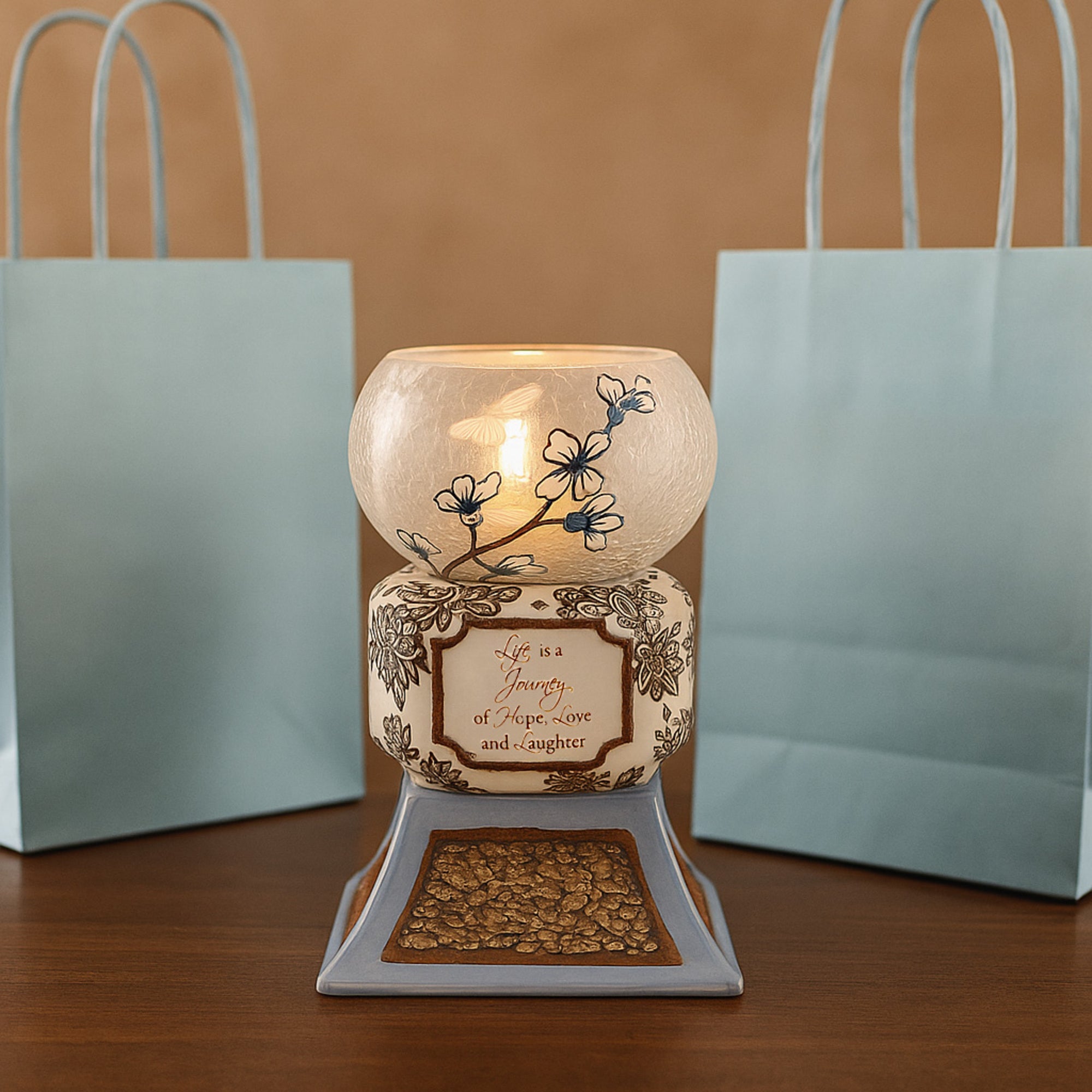 - IN-HOUSE DESIGN: "Life Is A Journey Of Hope, Love And Laughter" text is printed onto the front of the candle holder.