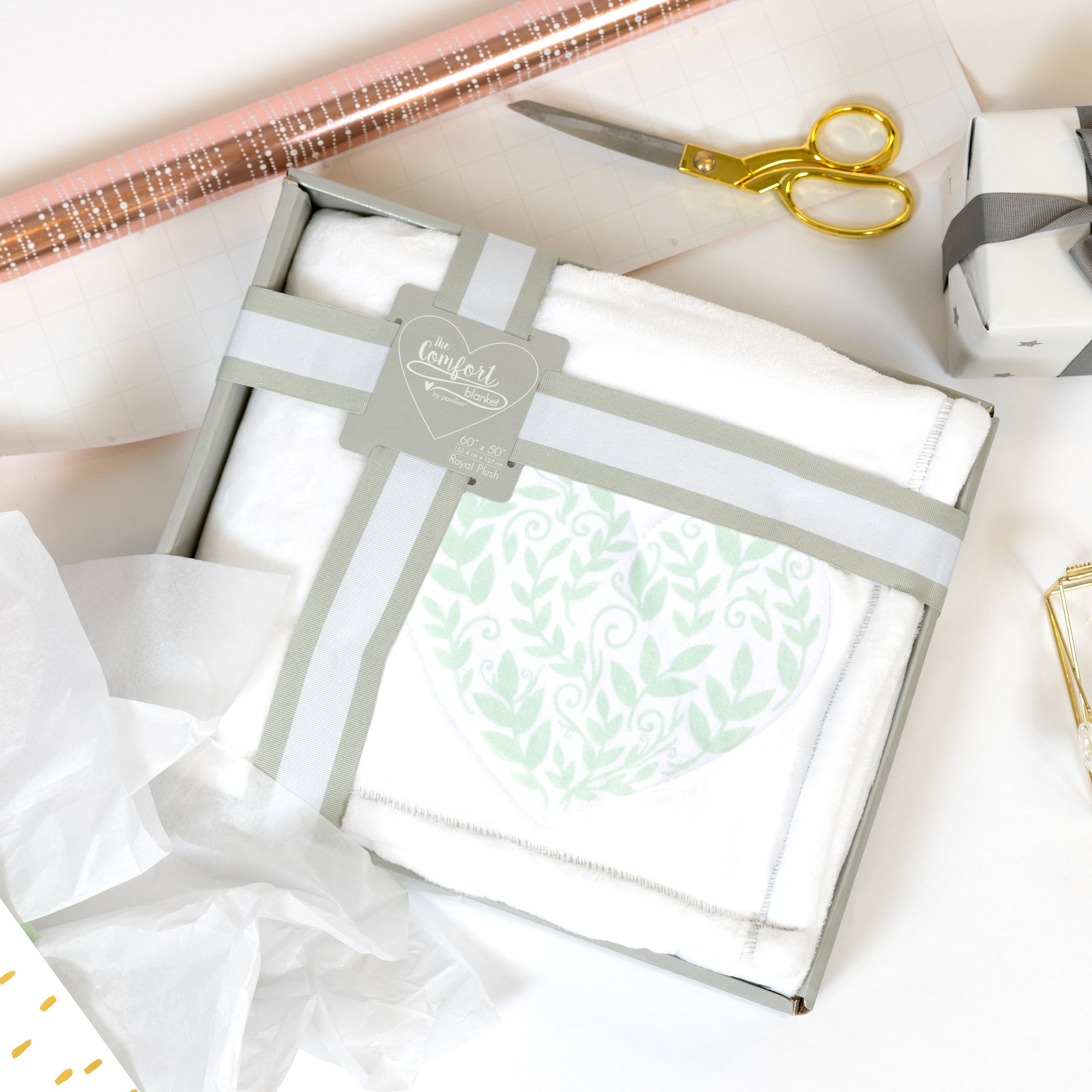 - IN-HOUSE DESIGN: The bottom right corner of the front of the white home décor blanket features uplifting and comforting gray stitched edges on a white heart with a green vine-printed design embroidered edge patch.