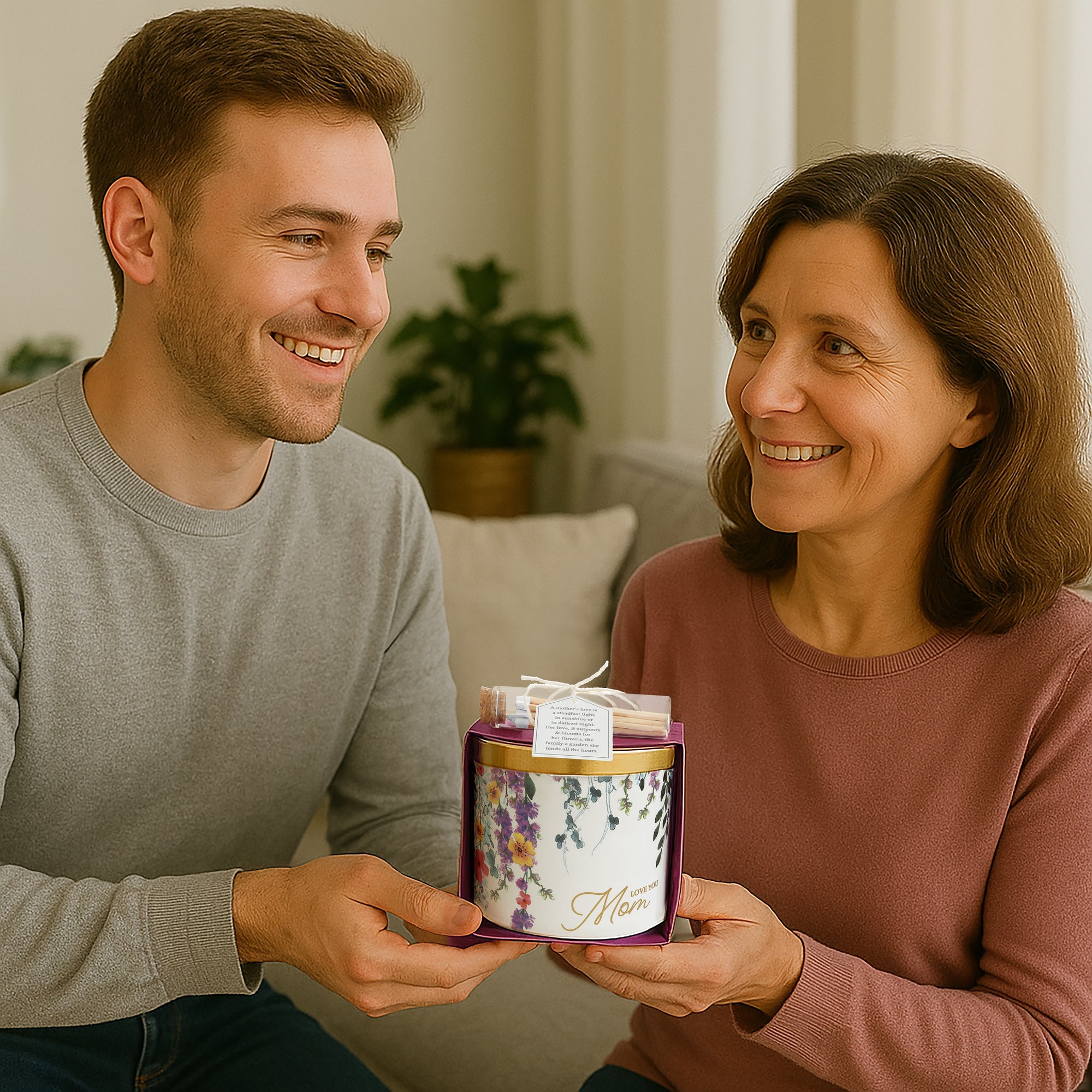 • IN-HOUSE DESIGN: Featuring cascading floral prints in vibrant hues, this candle is screen-printed with the loving message "Love You Mom" in gold script, celebrating the warmth, guidance, and unconditional love of mothers. The soft watercolor-style flowers bring a delicate touch, complementing the candle’s sophisticated yet heartfelt design.