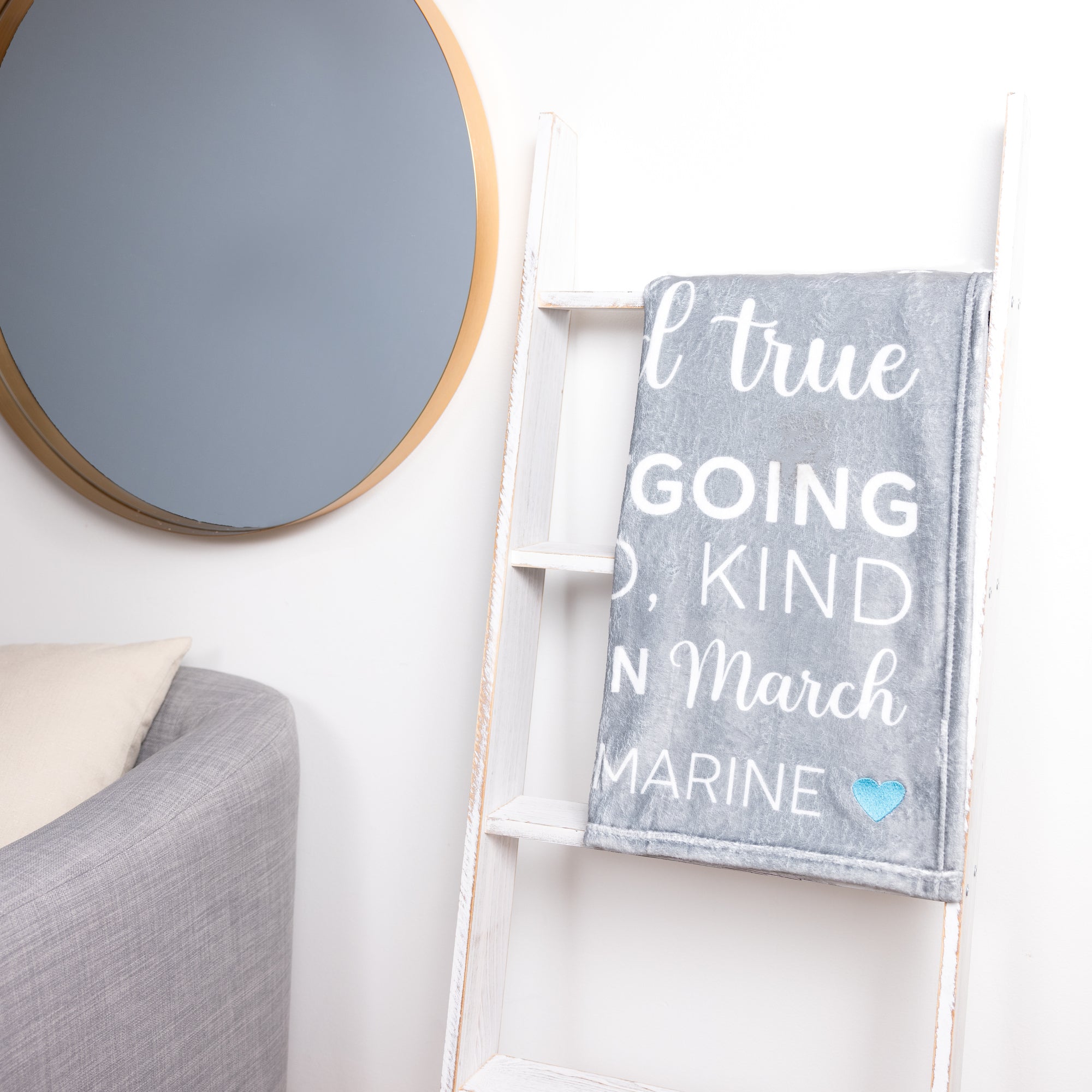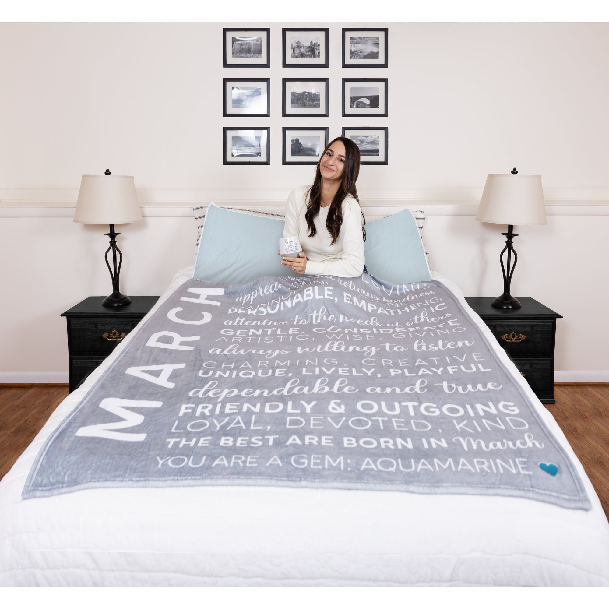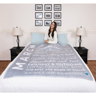- IN-HOUSE DESIGN: The printed sentiment read "March" down the left side of the blanket along with an "Honest, Generous, Affectionate, Successful, Loving, Appreciative And Returns Kindness, Caring, Understanding, Personable, Empathetic, Attentive To The Needs Of Others, Gentle, Considerate, Artistic, Wise, Giving, Always Willing To Listen, Charming, Creative, Unique, Lively, Playful, Dependable And True, Friendly & Outgoing, Loyal, Devoted, Kind. The Best Are Born In March. You Are A Gem: Aquamarine" which consists of a san serif and cursive font combo. The blue heart in the bottom corner of the blanket is embroidered. The reverse side is white only.