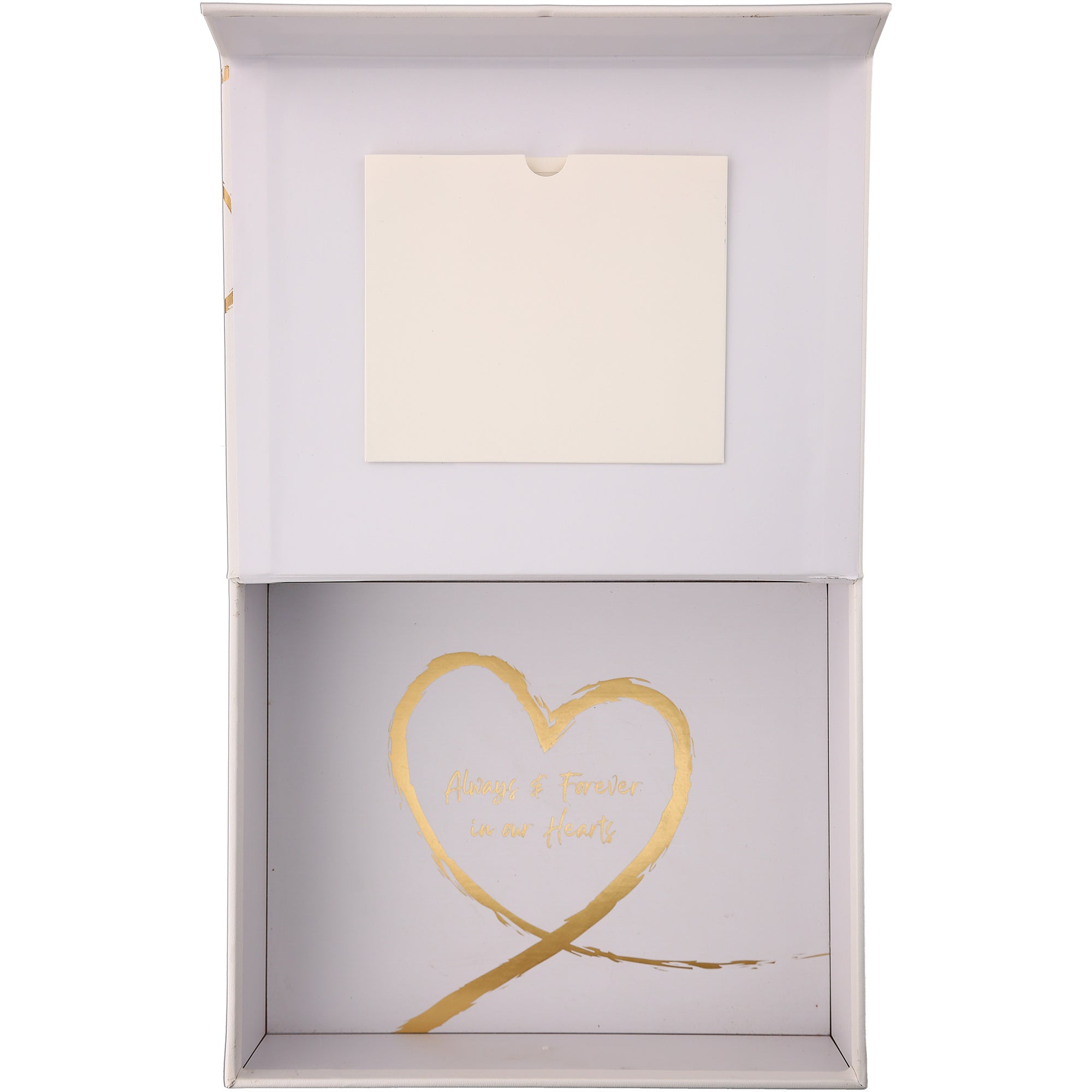 - IN-HOUSE DESIGN: The top of box is printed in gold sentiment that reads "When someone you love becomes a memory, that memory becomes a treasure". The interior bottom features a gold printed heart with the saying, "Always and forever in our hearts." The box is collapsible for easy storage.
