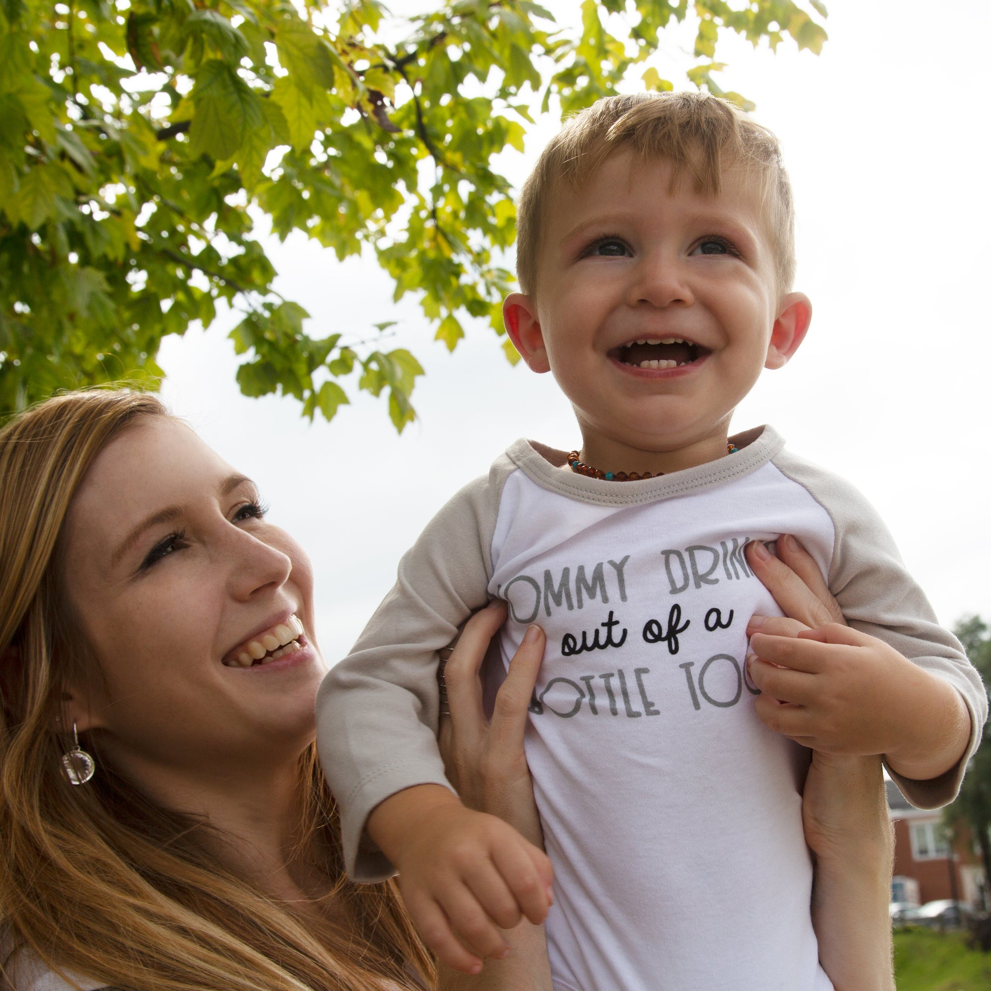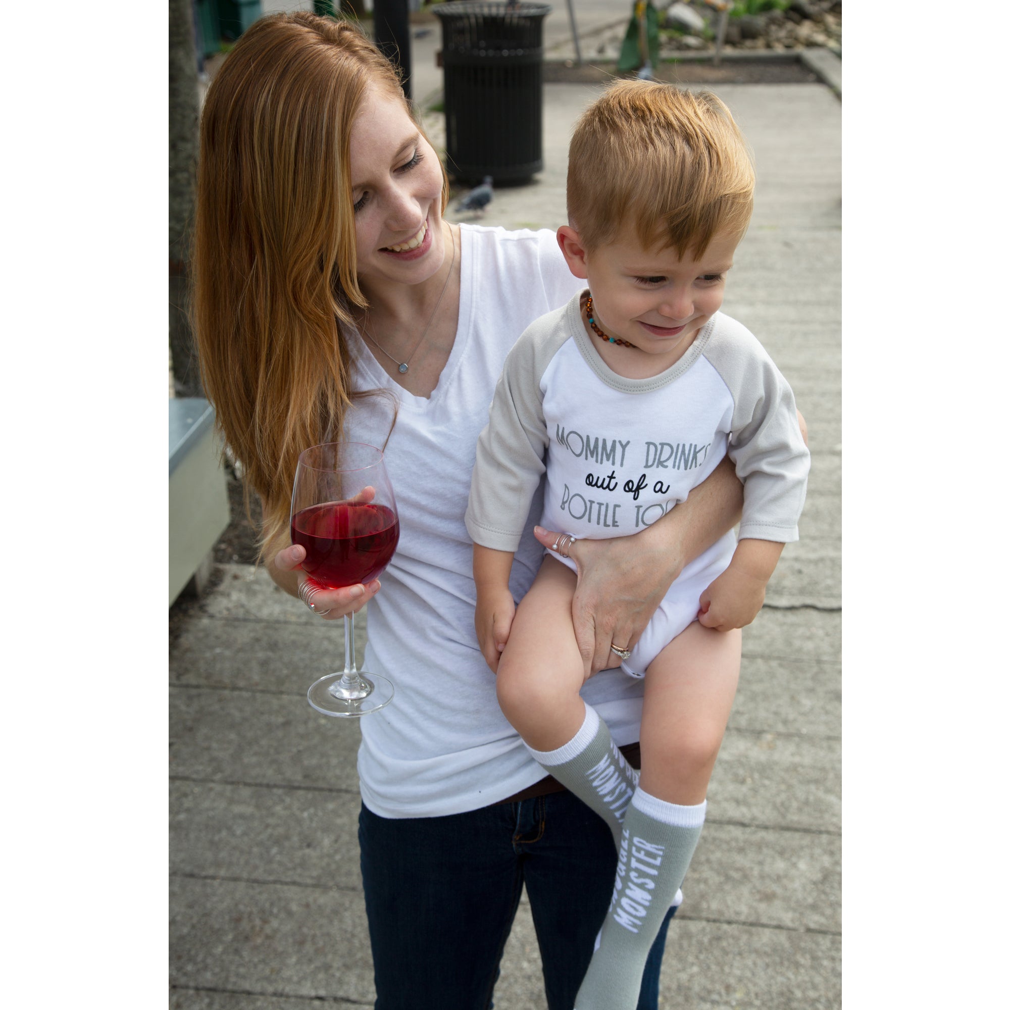 - IN-HOUSE DESIGN: "Mommy Drinks Out Of A Bottle Too" text is printed onto the front of the bodysuit.
