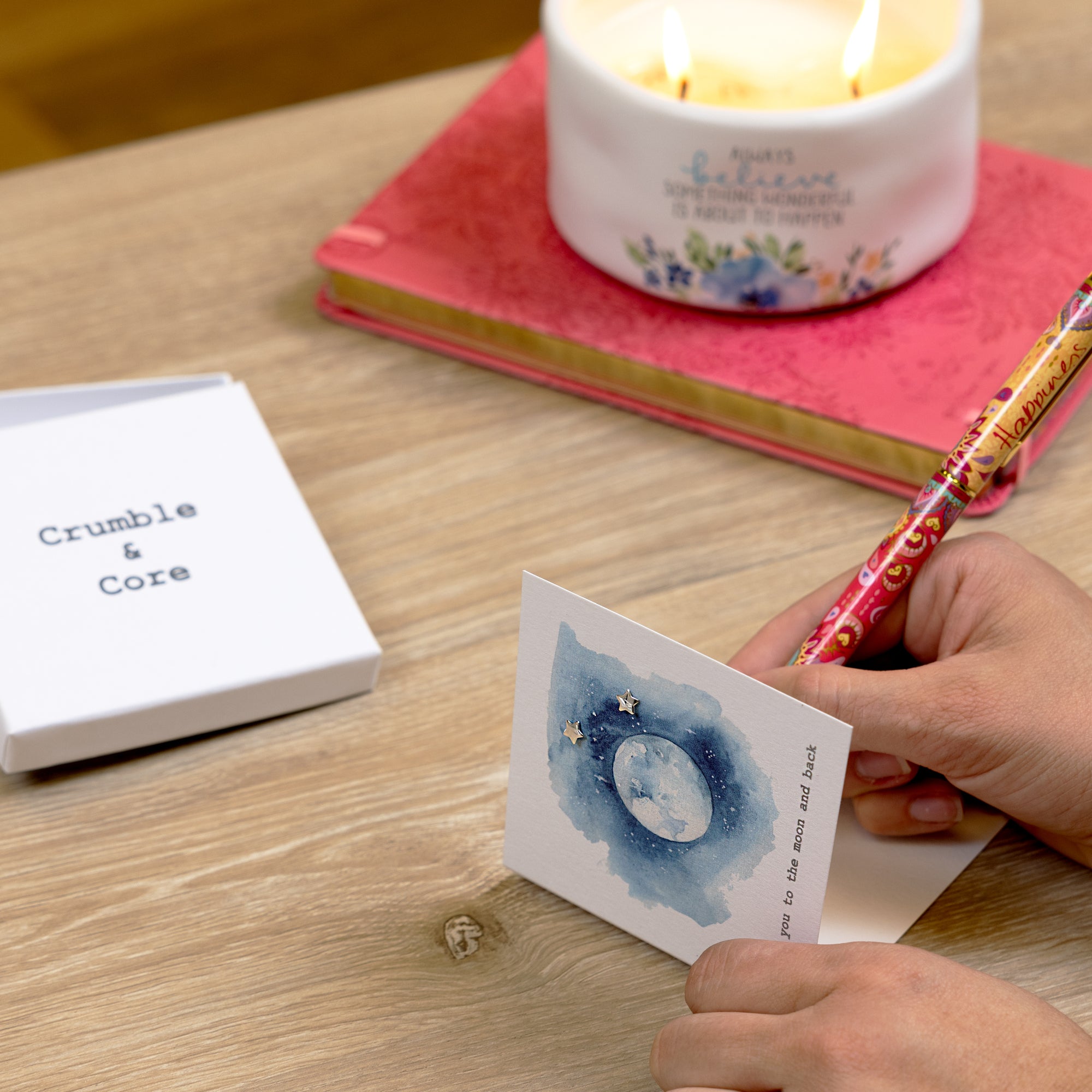 - IN-HOUSE DESIGN: The cheerful, celebratory printed watercolored night sky, including dark blue, stars, and a full moon, is designed with the earrings placed on the top right. The gray sentiment of the typewriter, "Love You To The Moon And Back," is placed in the bottom center.