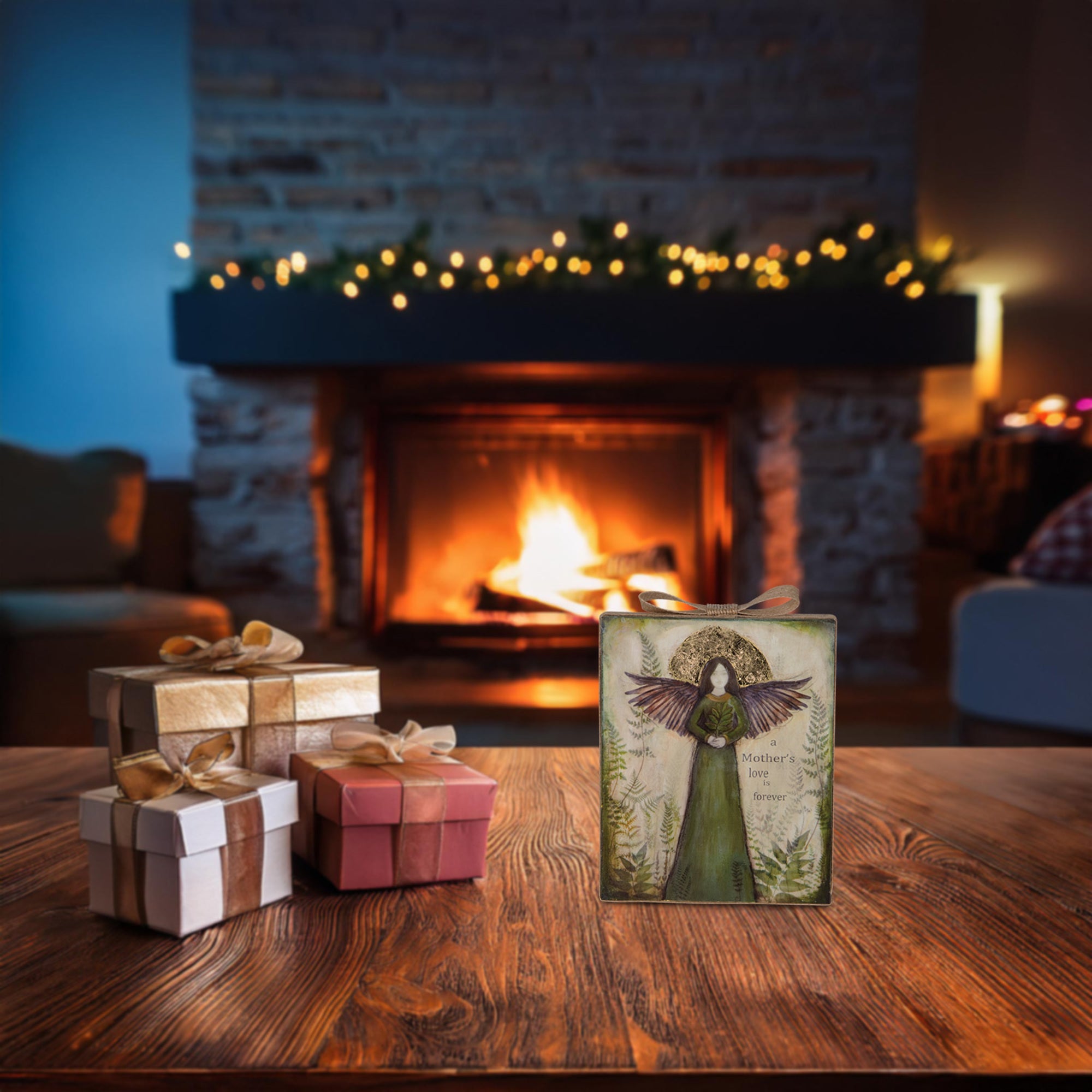 - IN-HOUSE DESIGN: Designed by renowned artist Sherry Cook, this plaque features a beautifully hand-painted angel standing amidst a forest setting. The heartfelt phrase, "A Mother's Love Is Forever," is elegantly printed on the front, making it a cherished piece of sentimental decor. The combination of soft, earthy hues and delicate detailing creates a soothing, nature-inspired aesthetic.