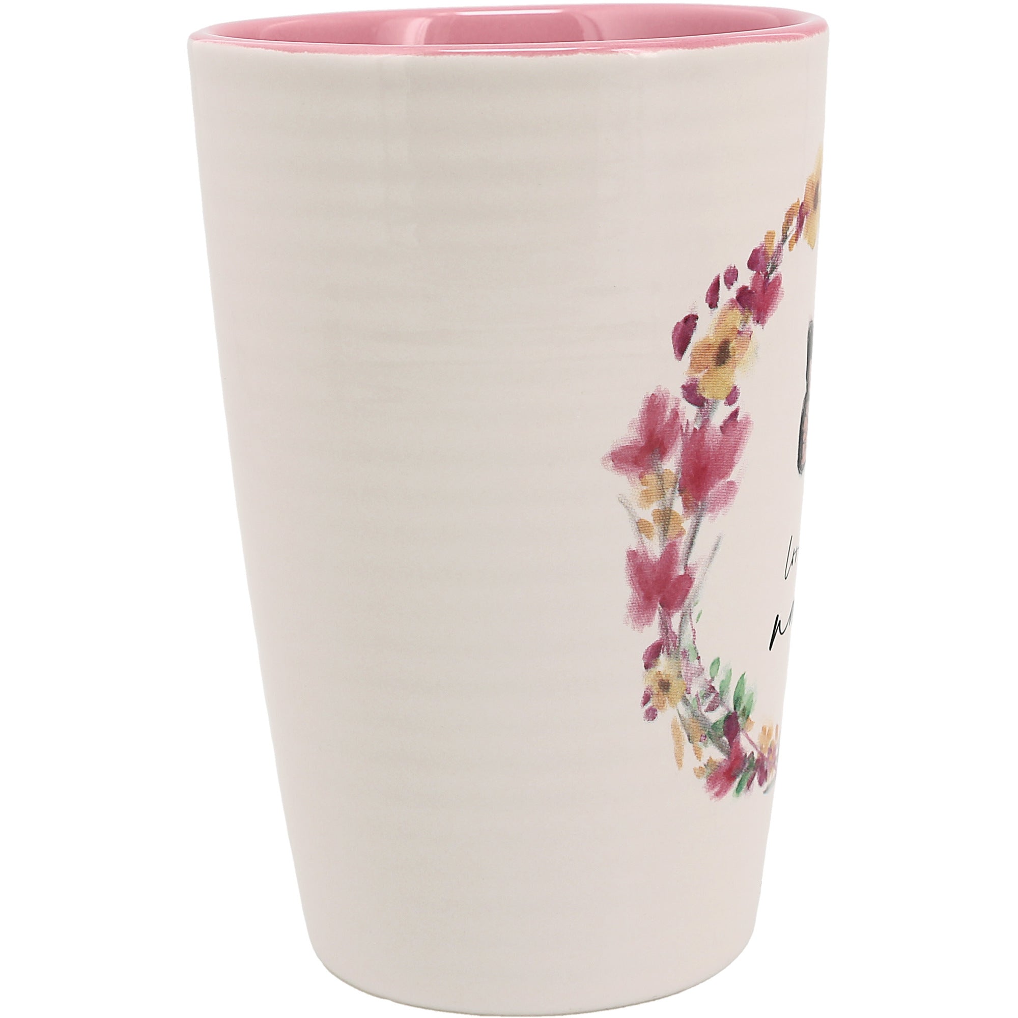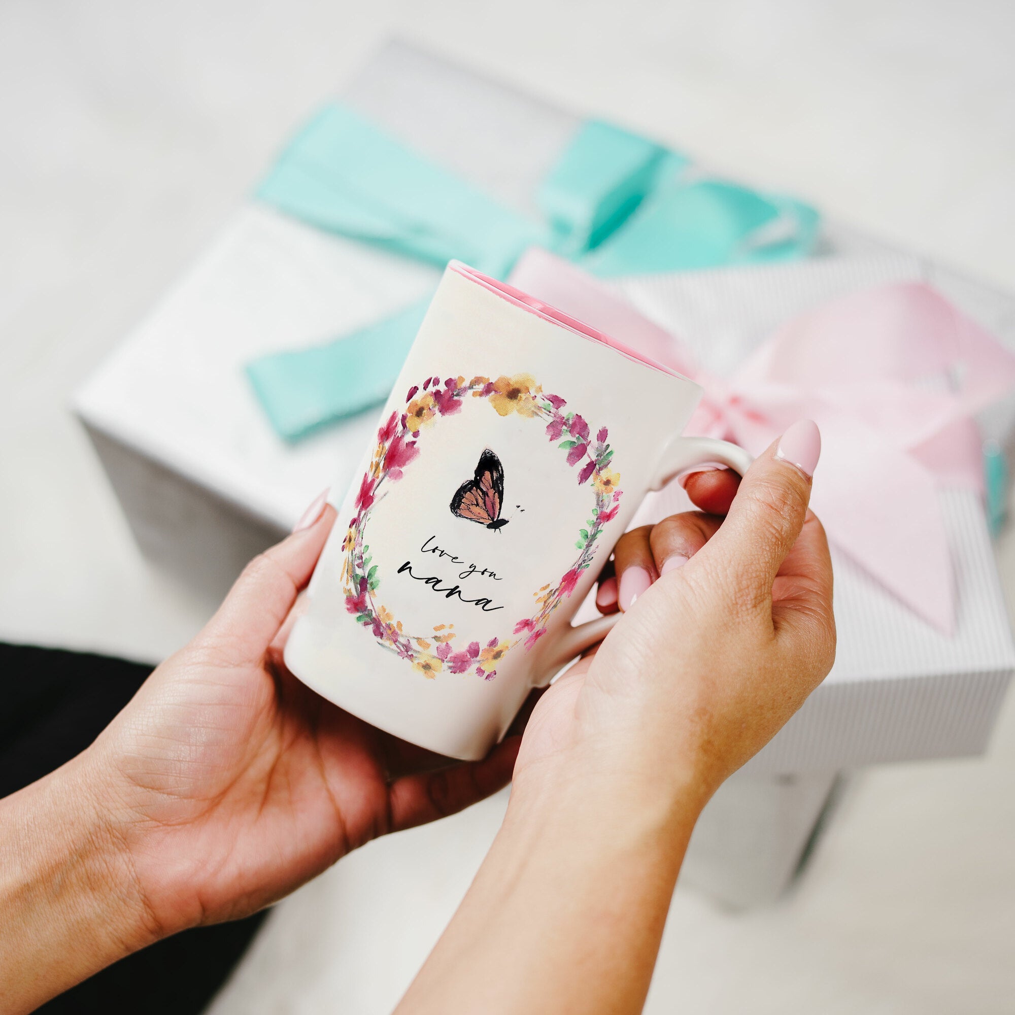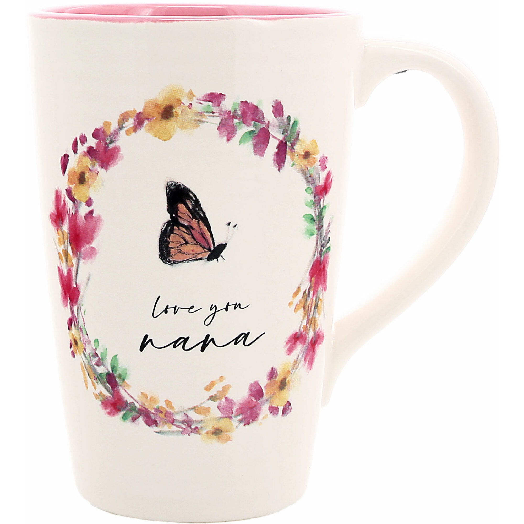 - IN-HOUSE DESIGN: Beautiful springtime patterns. Pink, yellow, green & purple floral wreath hugs a monarch orange & black butterfly and a "Love you Nana" sentiment in the center bottom of the flower crown. The mug's interior is pink, whereas the exterior is creamy white.