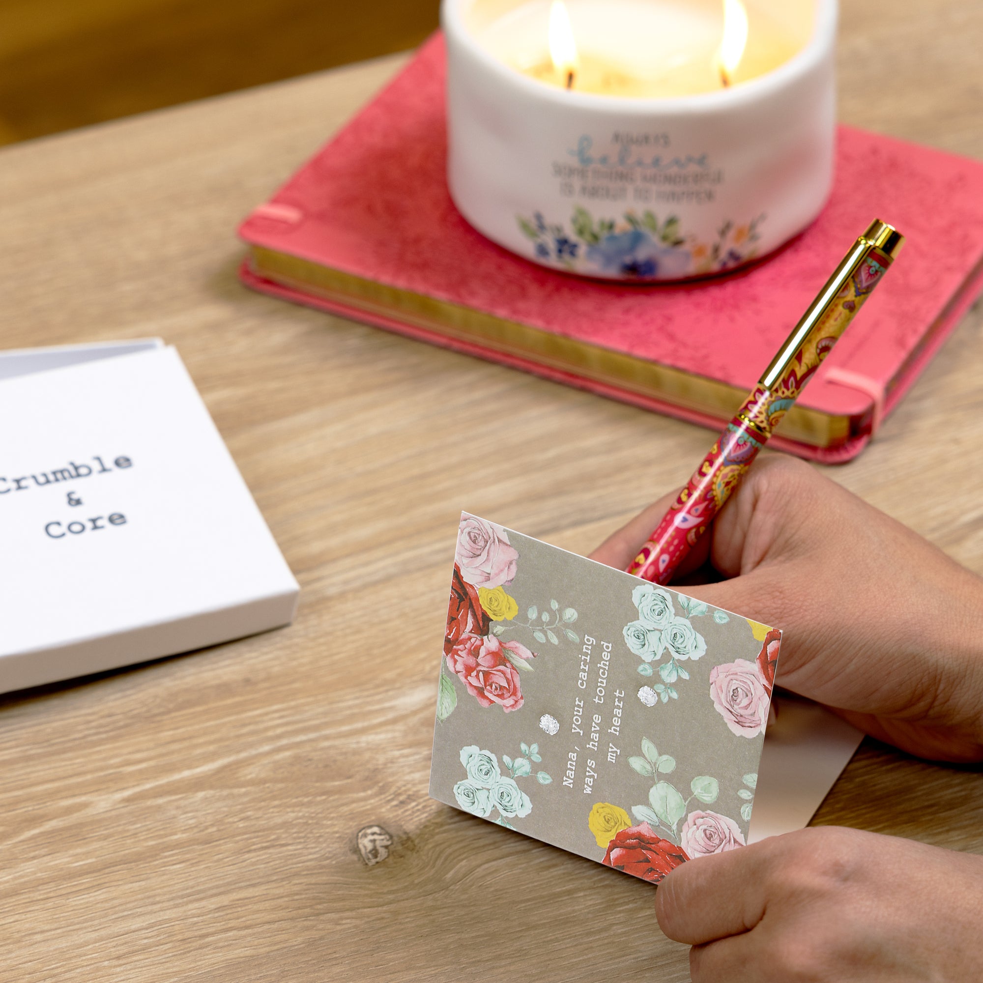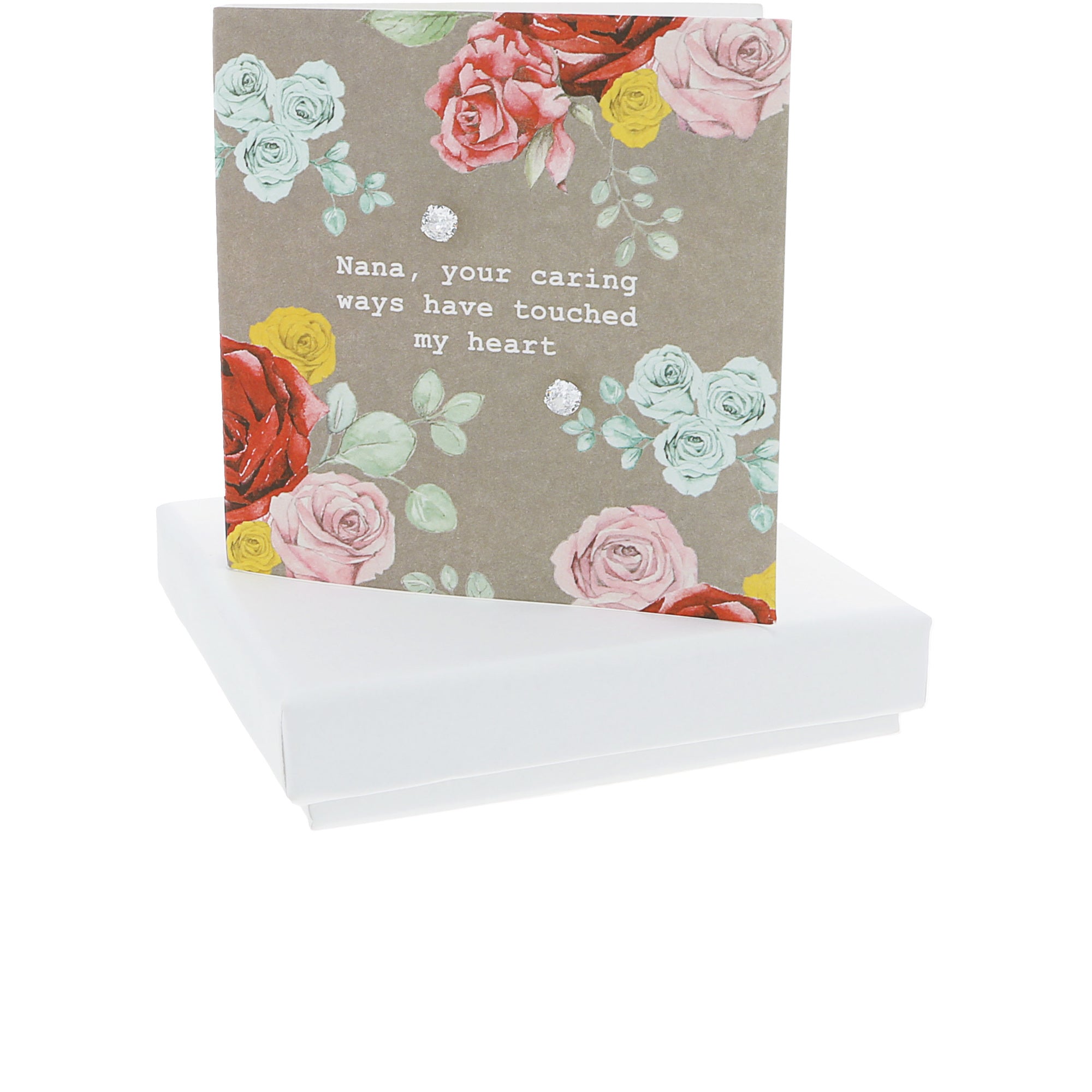 • IN-HOUSE DESIGN: The printed card has a gray background and a beautiful blue, yellow, pink, and red rose floral design. The earrings are strategically placed within the florals. The typewritten white "Nana, Your Caring Ways Have Touched My Heart" sentiment is placed in the center of the greeting card.