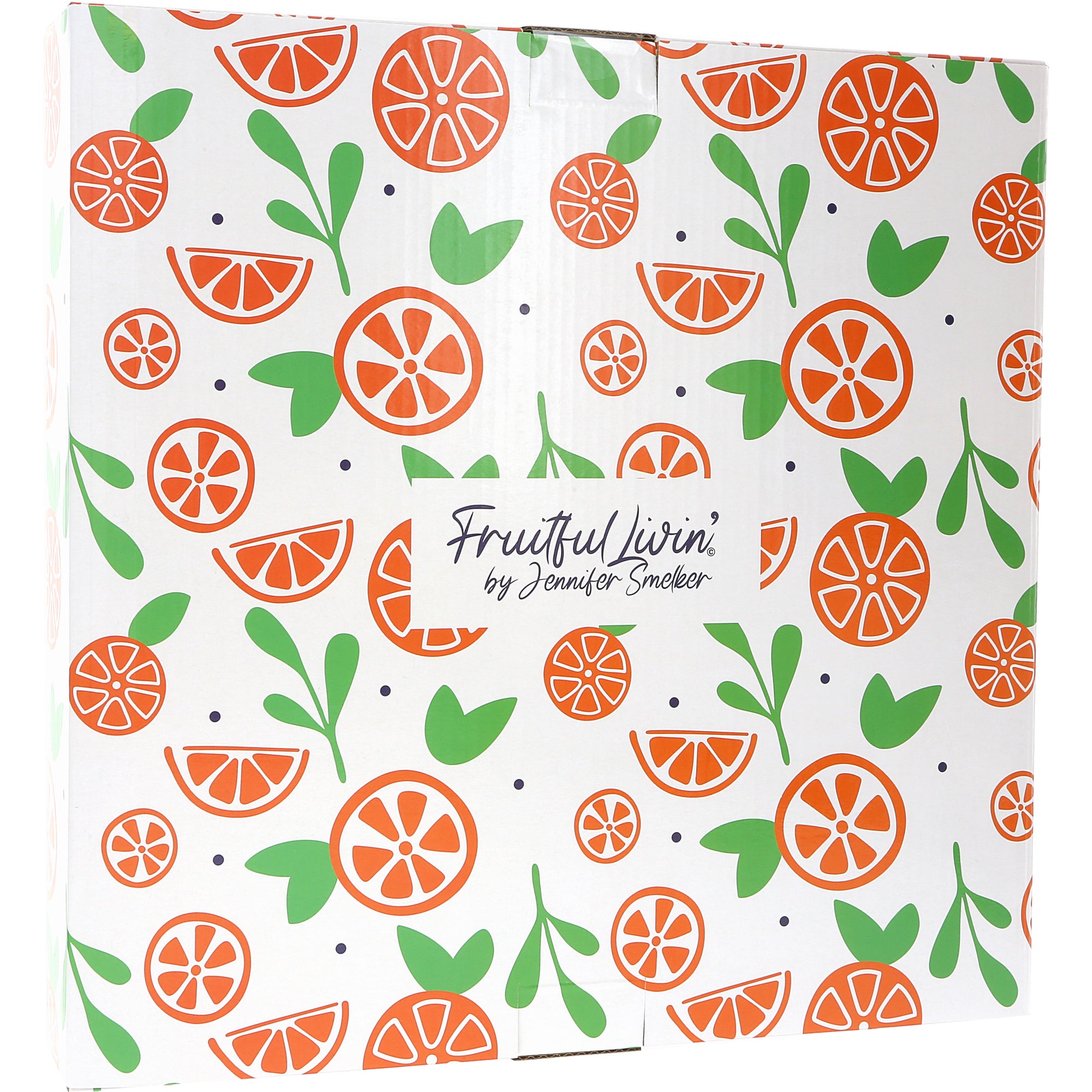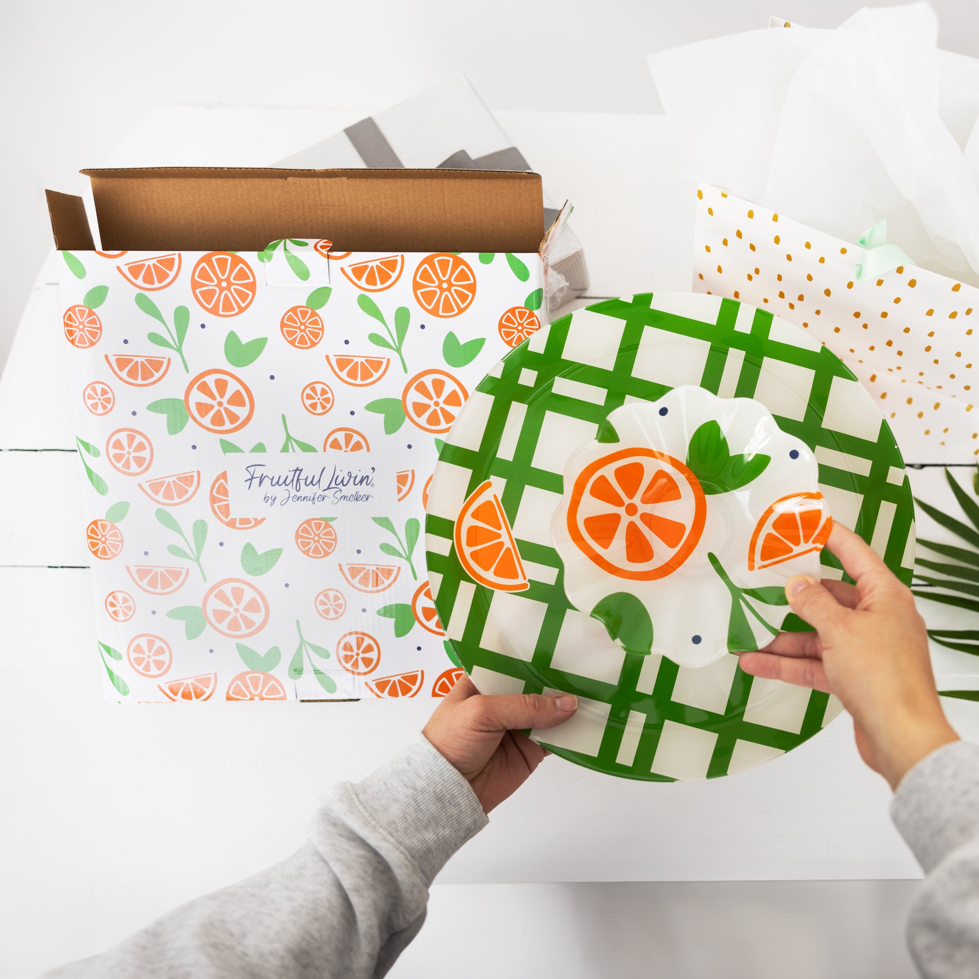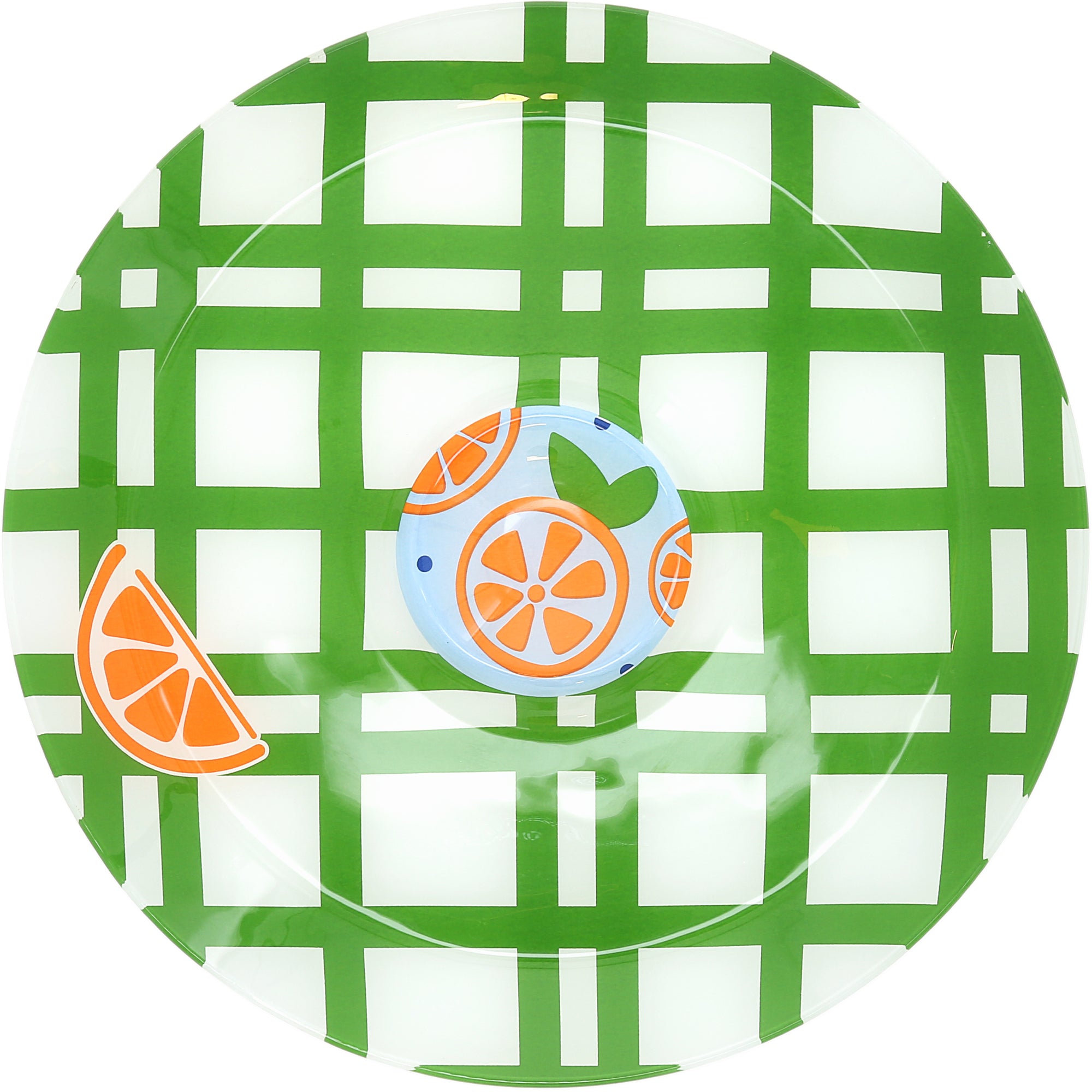 - IN-HOUSE DESIGN: The 6" bowl has large and bold halved and wedged oranges are accompanied by greenery leaves and blue polka dots on a white background. The tray has a white background with green plaid and one wedged orange, and the center has a blue background with halved oranges.