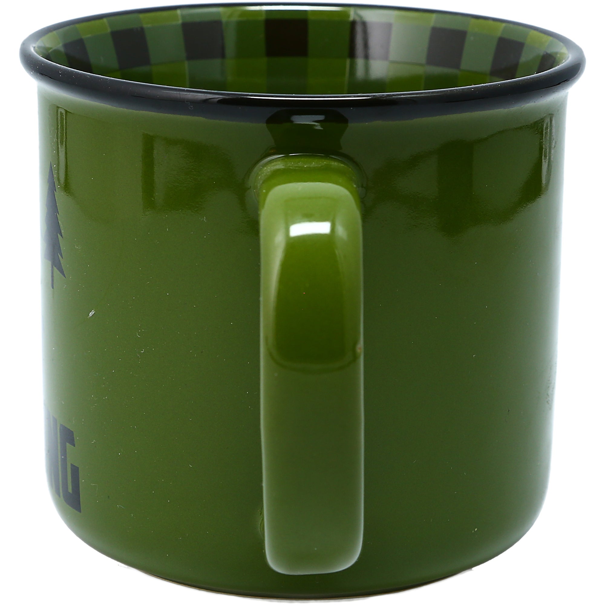 - IN-HOUSE DESIGN: The green coffee cup features an "Out Camping" one-sided design accompanied by an interior plaid wrap-around pattern and a trio of pine trees decal.