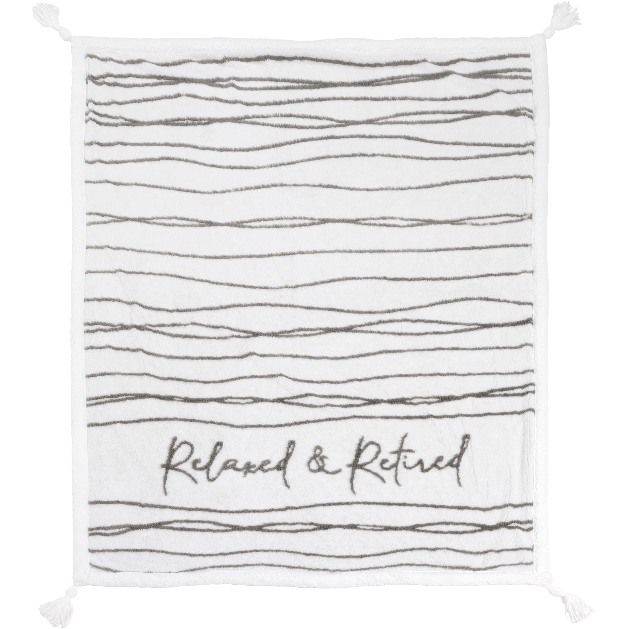 - IN-HOUSE DESIGN: The Rosen cursive sherpa "Relaxed & Retired" gray sentiment is conveyed with gray wave-like patterns on the blanket, which has a beautiful white background.