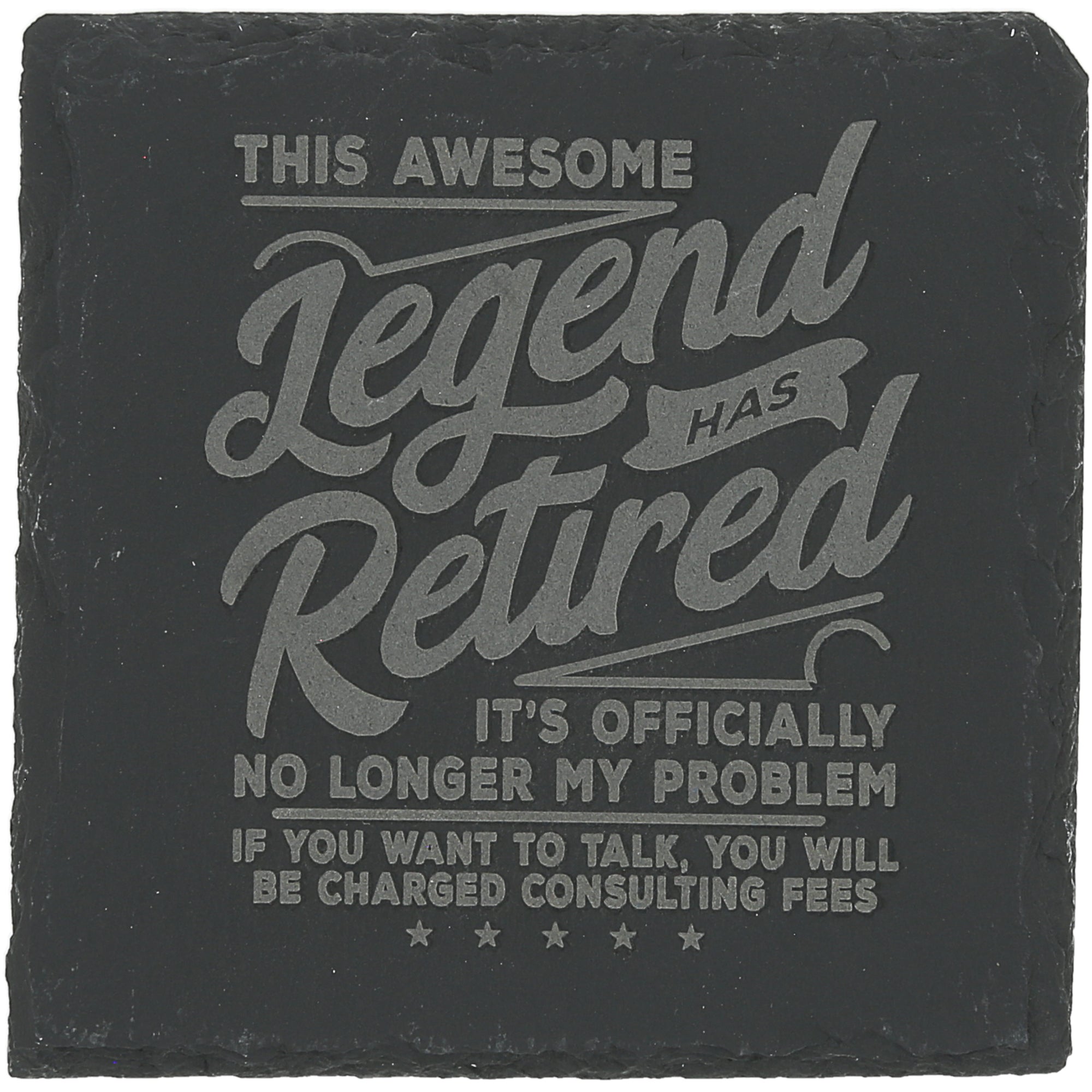 - PREMIUM QUALITY: This 4" x 4" slate coaster features engraved detailing and foam feet for stability. Its durable slate design makes it both functional and stylish, with the sentiment "This Awesome Legend Has Retired It's Officially No Longer My Problem If You Want To Talk, You Will Be Charged Consulting Fees" deeply engraved for a lasting impression.