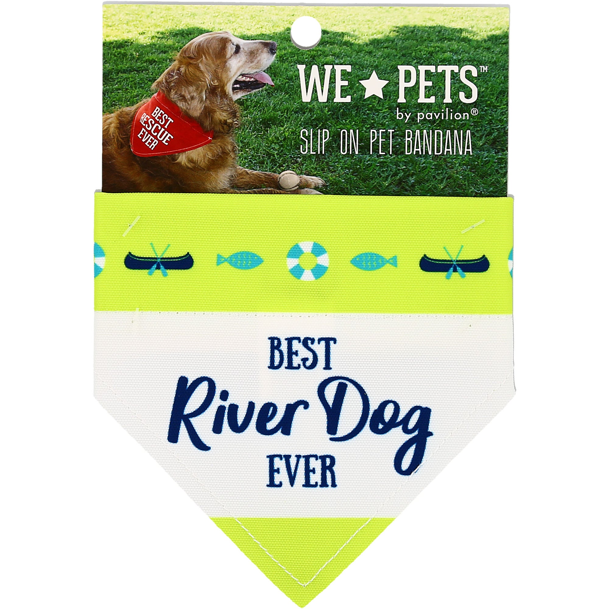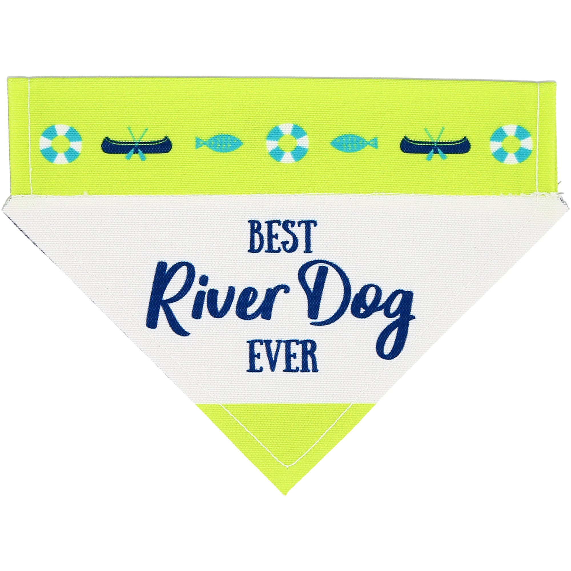 - IN-HOUSE DESIGN: "Best River Dog Ever" text and accompanying lure, fish, and life raft icons are printed onto the front of the bandana.