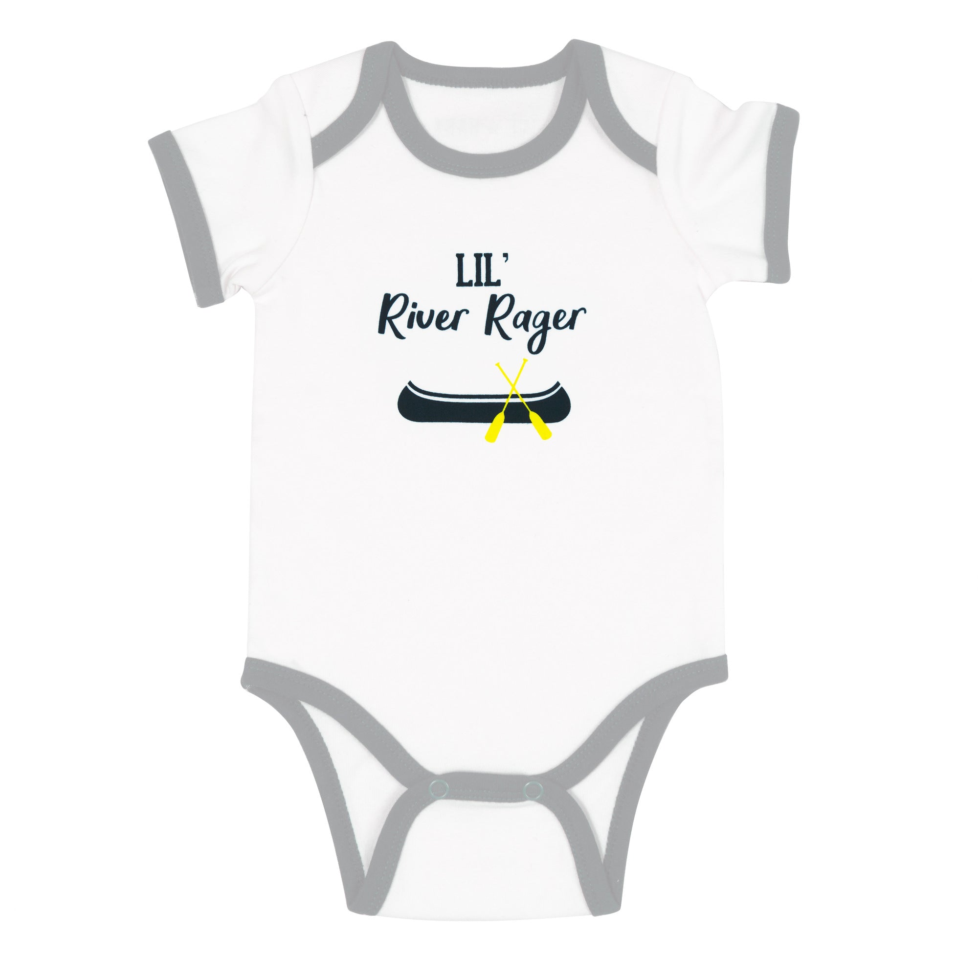- IN-HOUSE DESIGN: "Lil' River Rager" text and accompanying boat and oar icons are printed onto the front of the bodysuit.