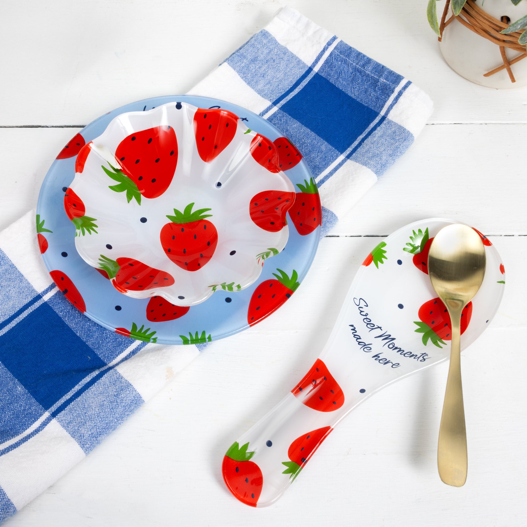 - IN-HOUSE DESIGN: The bowl features a playful strawberry pattern with bright red berries and green leaves scattered across the surface. The scalloped edges add an elegant touch, enhancing both the aesthetic and functional appeal. This charming fruit-themed design brings a cheerful and fresh feel to any kitchen or dining space, making it perfect for spring and summer table settings.
