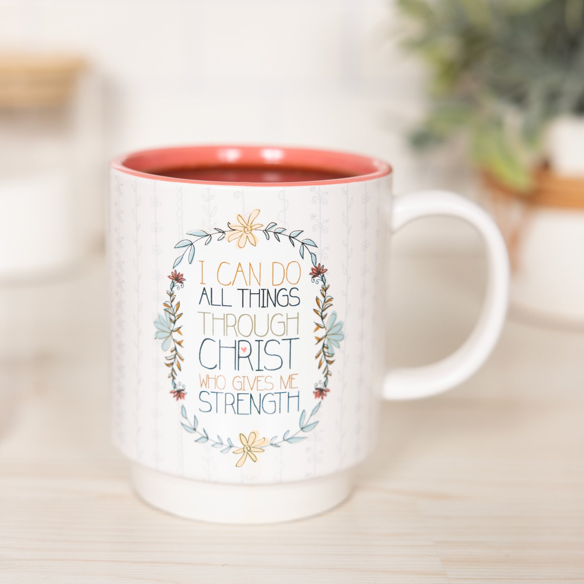 - IN-HOUSE DESIGN: Featuring a faith-inspired sentiment, this mug displays the uplifting message: "I can do all things through Christ who gives me strength." The soft neutral tones and intricate floral detailing make it a timeless and elegant piece, perfect for daily encouragement and reflection. The matte exterior pairs beautifully with the glossy interior, creating a sophisticated and meaningful design.