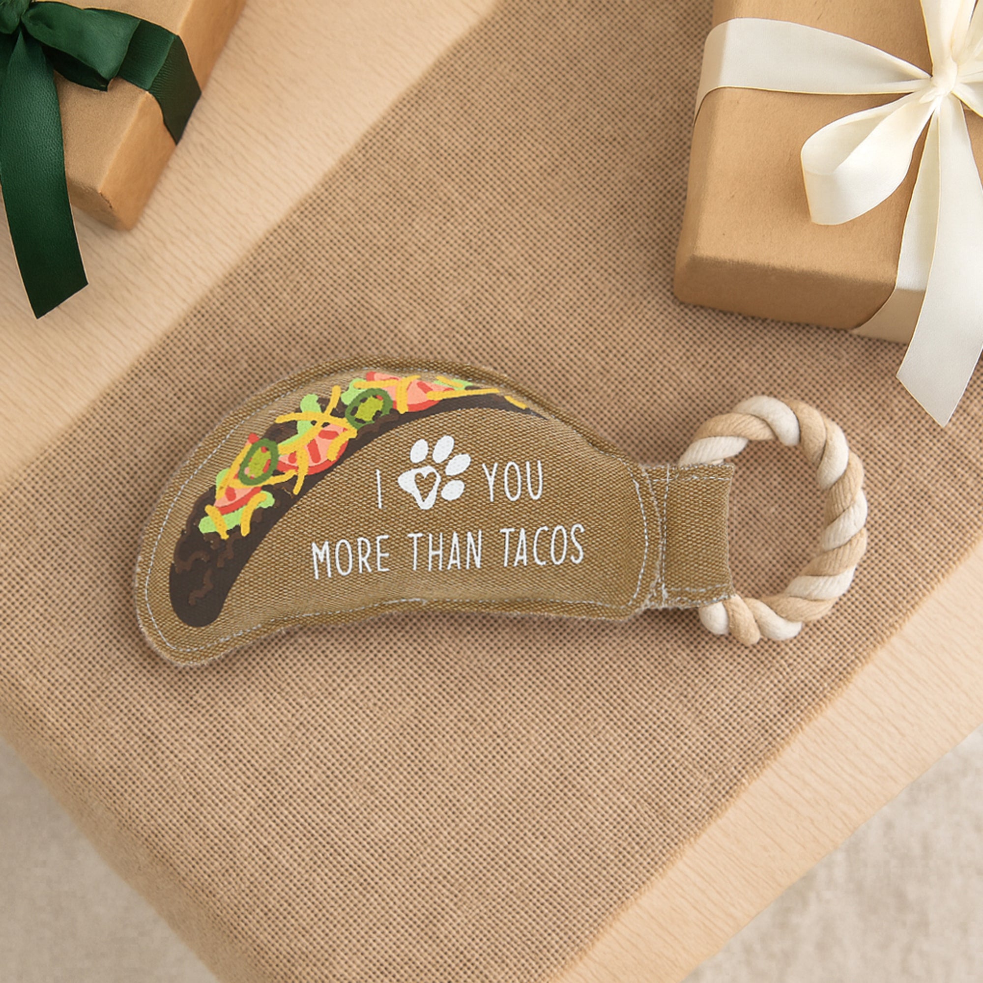 - IN-HOUSE DESIGN: Bright and playful, the toy mimics the look of a taco complete with embroidered fillings and the phrase “I Love You More Than Tacos” stitched in bold, contrasting font. The rope loop completes the taco shell shape and adds to its fun, food-themed charm.