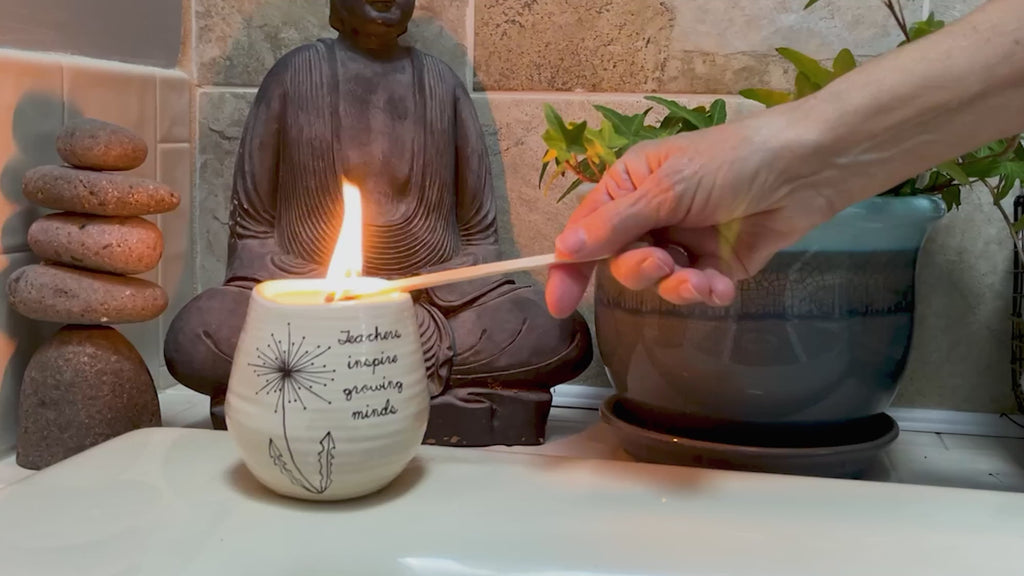 - IN-HOUSE DESIGN: "Teachers Inspire Growing Minds" text on the front of the candle is printed, as are the accompanying dandelion details.