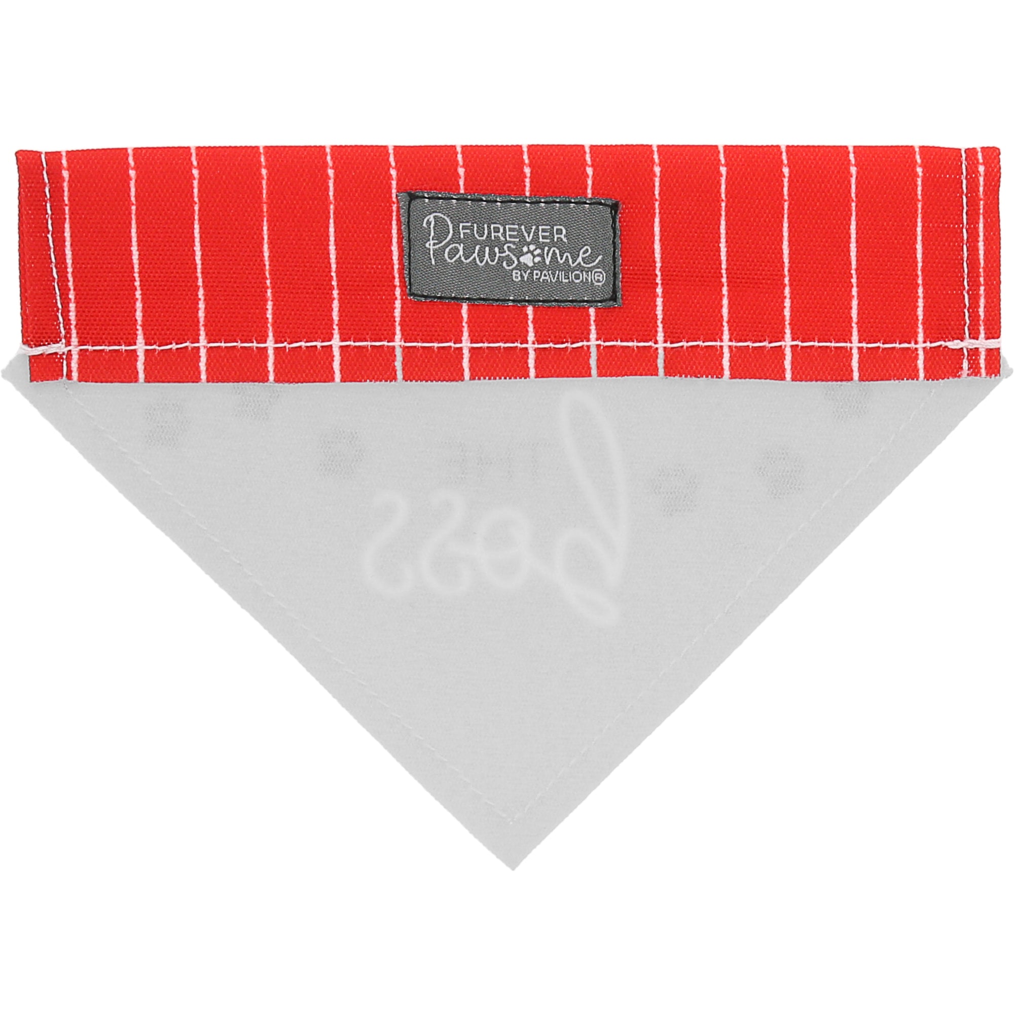 - IN-HOUSE DESIGN: The red background features a white vertical striped design on the over-the-collar part. The bottom gray section has a "The Boss" white and gray sentiment with a pawprint pattern. The backside has a sewn-in logo tag on the striped section and a soft touch finish for comfort finish on the bottom triangle part.