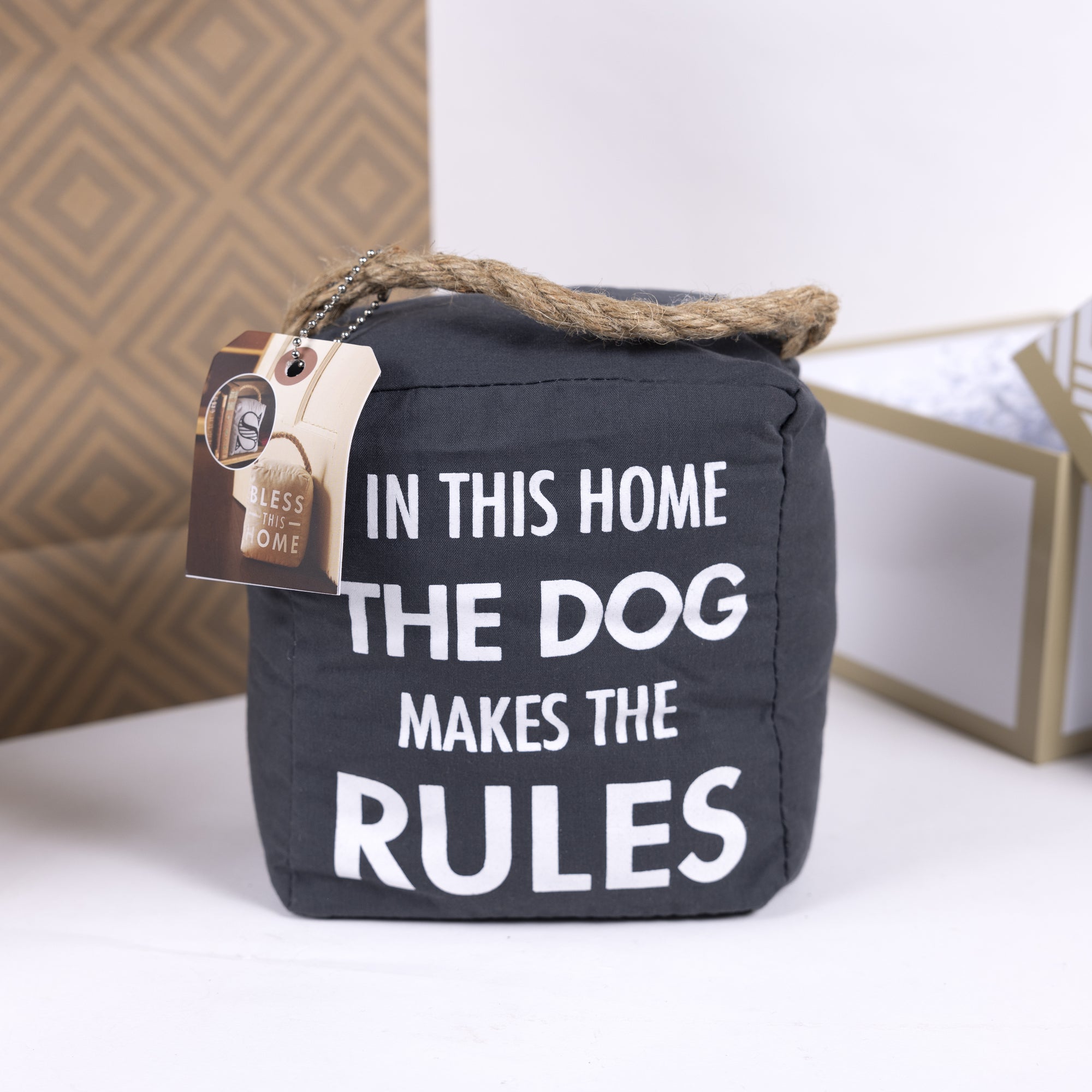 - IN-HOUSE DESIGN: The overall gray stopper has a white screen printed "In This Home The Dog Makes The Rules" sentiment on the front side of the bean bag. Also, utilize these as bookends, even put behind a door to prevent the handle from damaging the walls or in front to keep the door propped open.