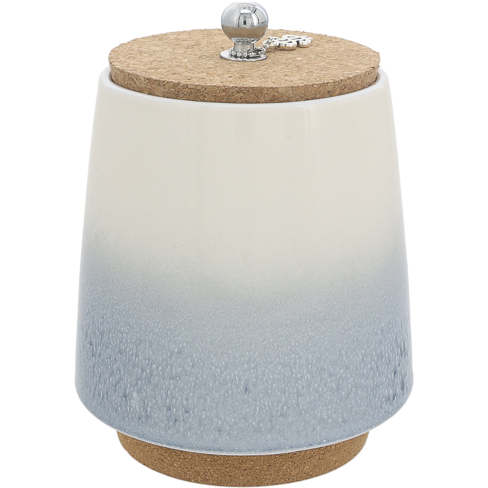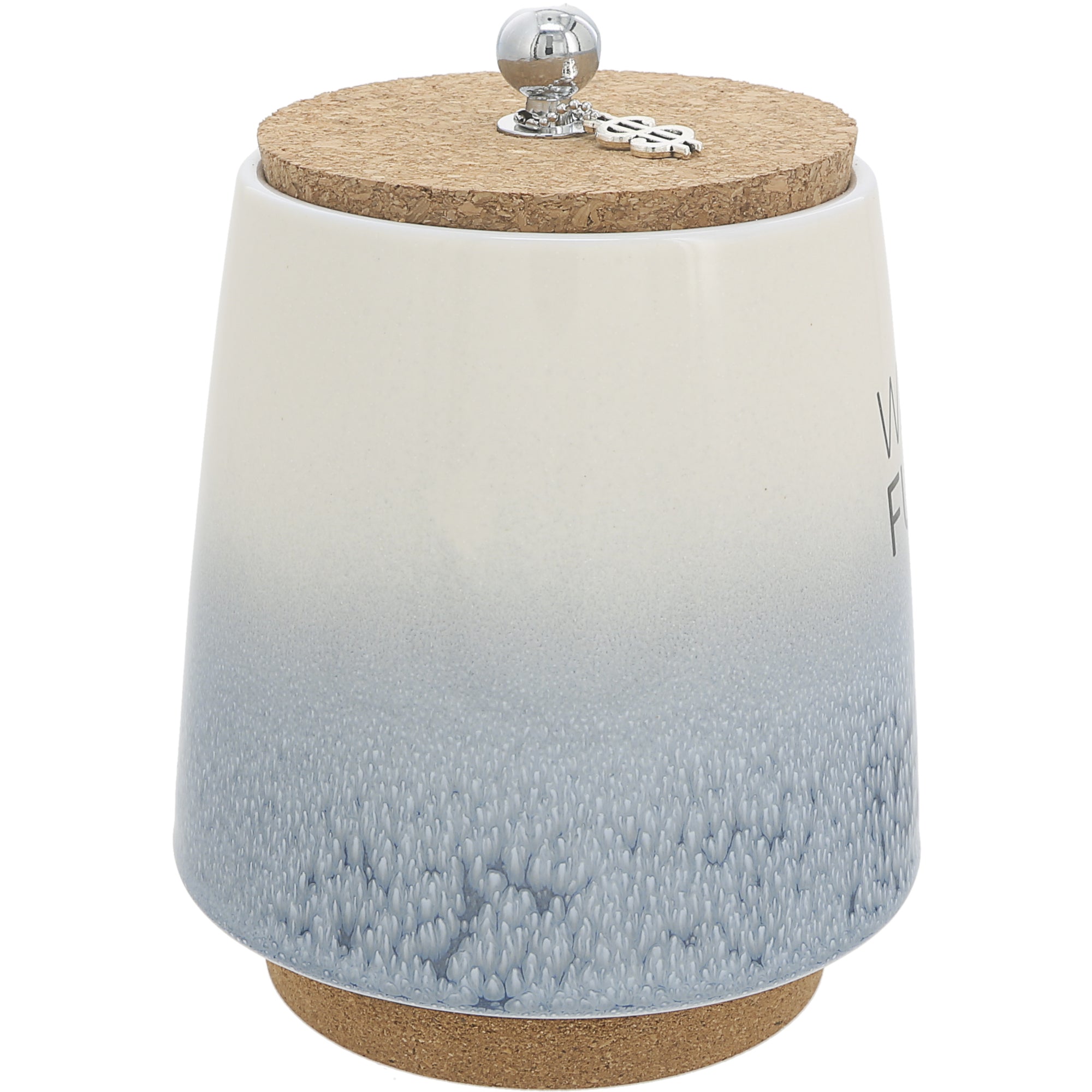- PREMIUM QUALITY: This incredible money-holding jar is 6.5" tall. The base of the stoneware vessel is 4.5" wide, tapering to 3.5" wide towards the top, where the cork lid narrows from top to bottom to fit snuggly inside the lip of the container. A 1.75" length metal chain holds a removable $ icon keychain that can be added to your keys or left connected to the .5" wide x .75" tall rounded metal ball handle. The base is made from cork to prevent surfaces from scratching and provides an easier grip to pick up the canister.