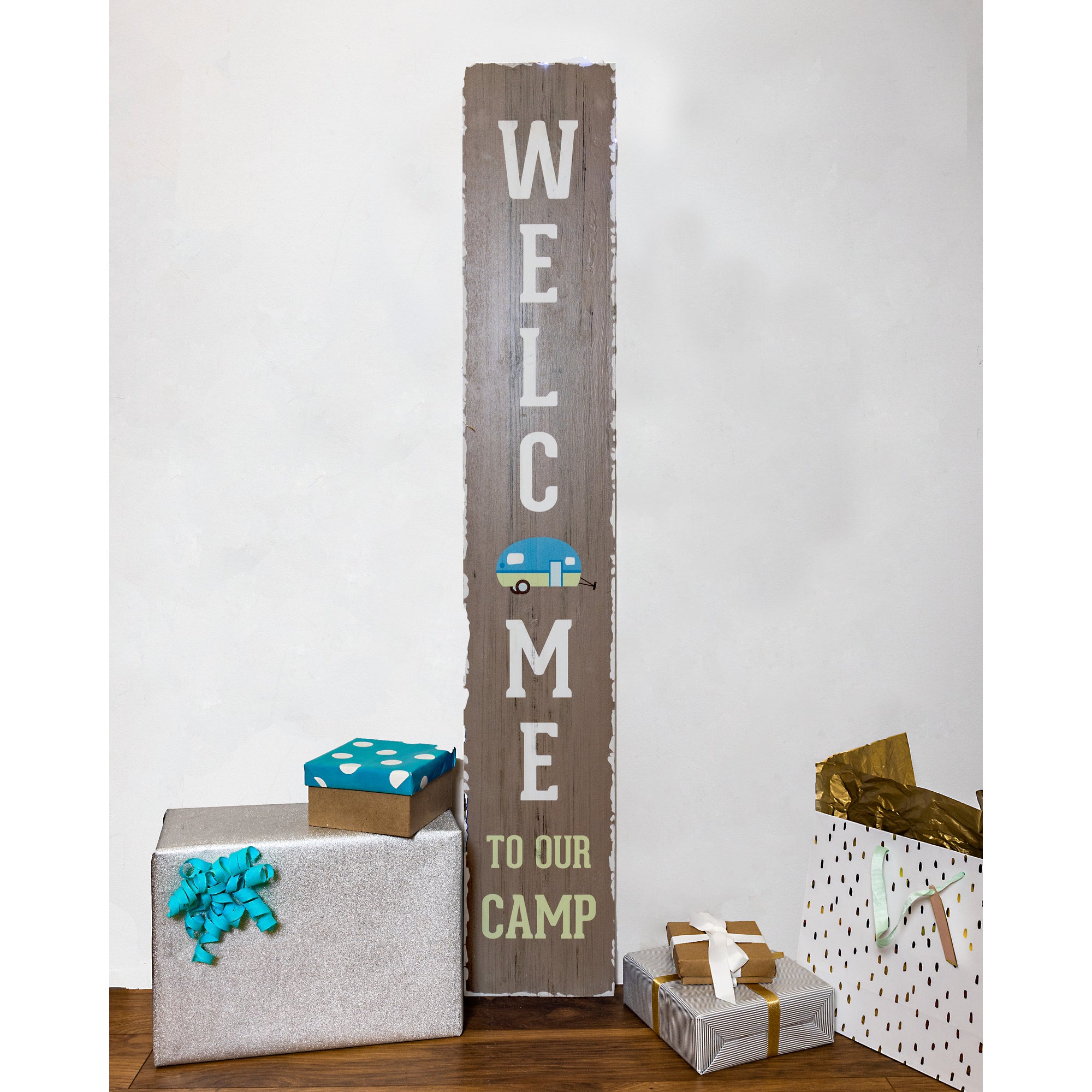 - IN-HOUSE DESIGN: The back has been left as natural wood. The sides have a rustic white paint finish. The front side has a rustic white edge finish, a tan background, and a large letter, "Welcome To Our Camp," with white, light green, and teal sentiment. The "O" in welcome is a camper RV.