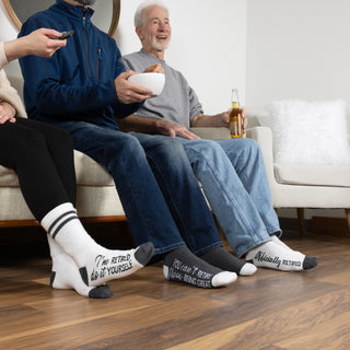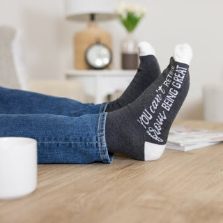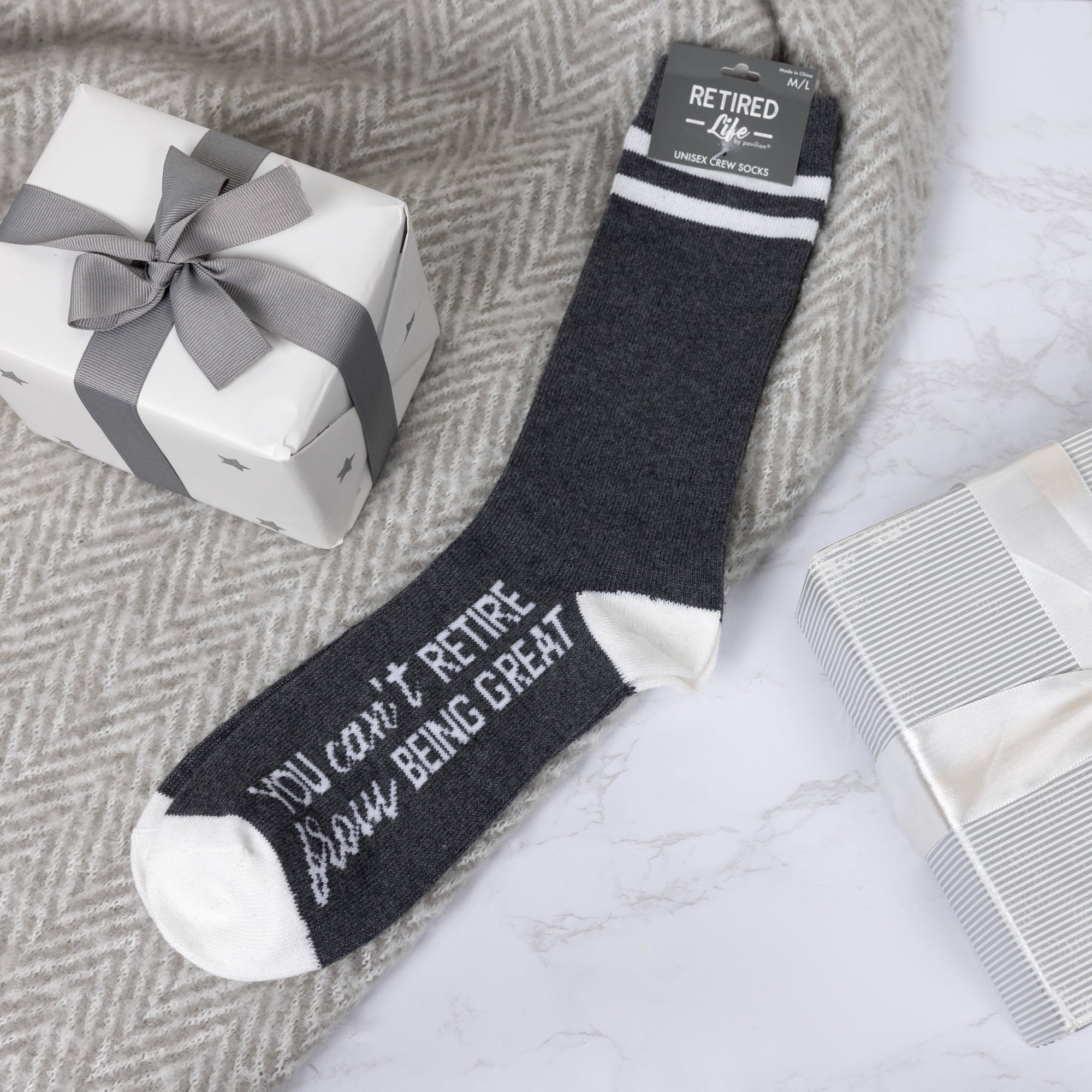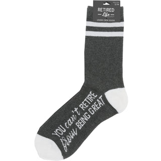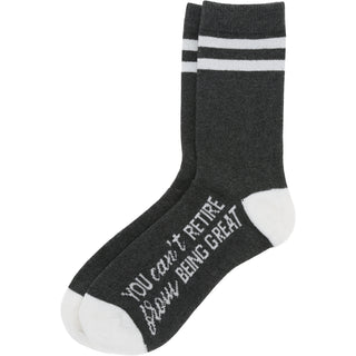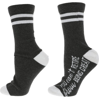 - IN-HOUSE DESIGN: The crew socks have a white ankle, toe & heel with a gray body and a white "You Can't Retire From Being Great" sentiment on the outer lateral of the boot socks. The top of the crew socks have two stripes.